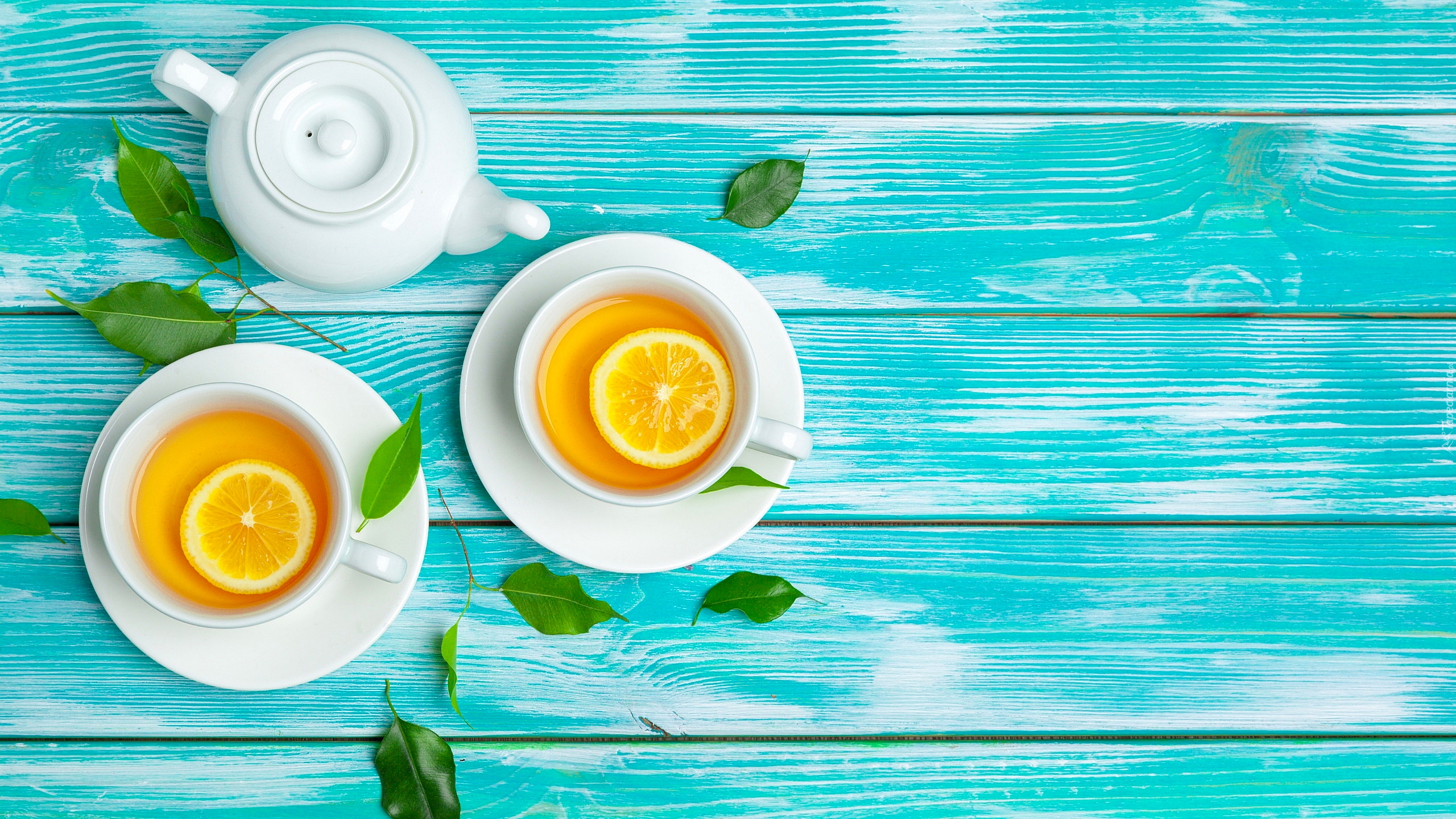 Edytor tapety: Dwie filiżanki herbaty z cytryną obok czajniczka