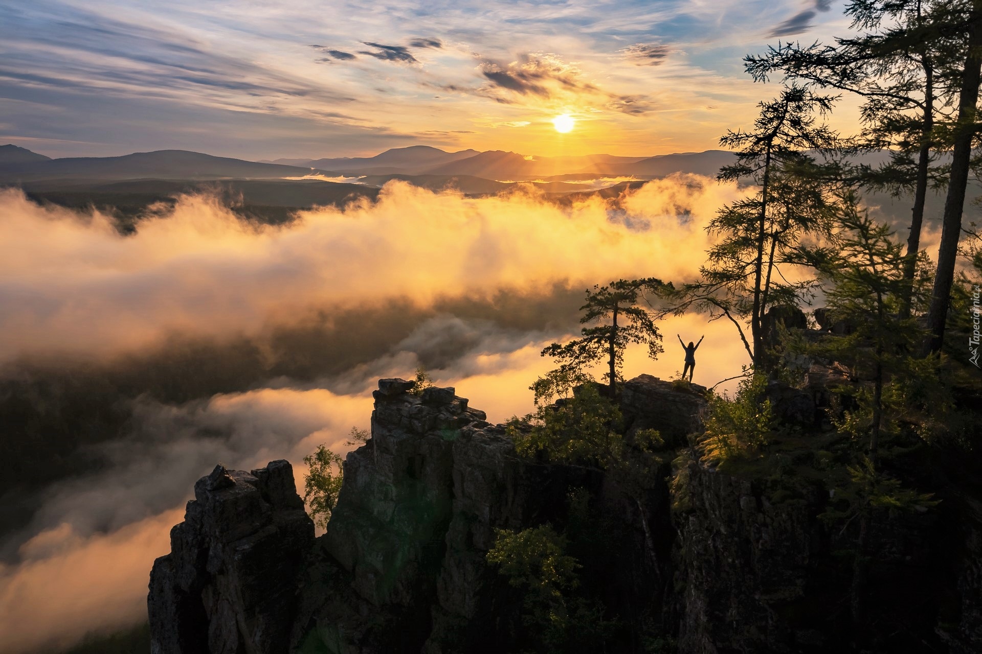 Edytor tapety: Postać na skałach o wschodzie słońca