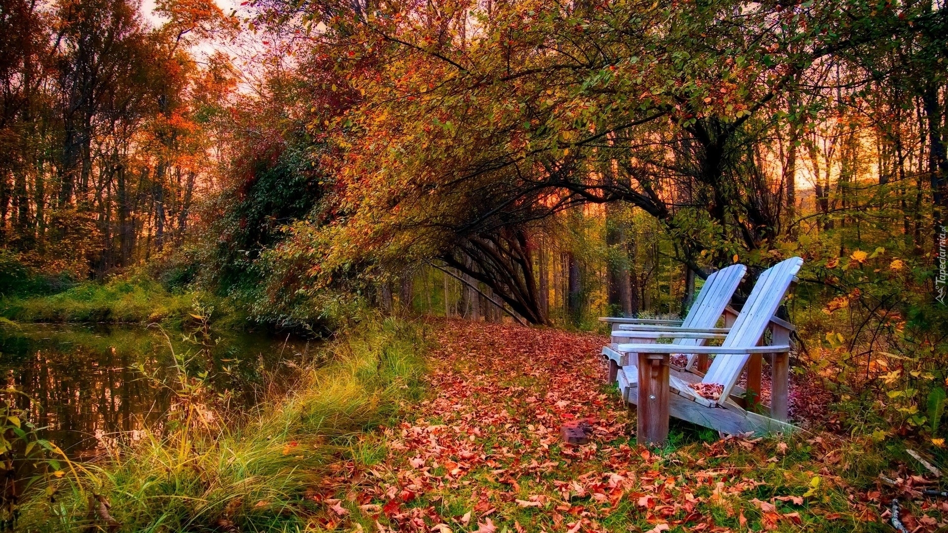 Edytor tapety: Krzesła pod jesiennymi drzewami nad stawem
