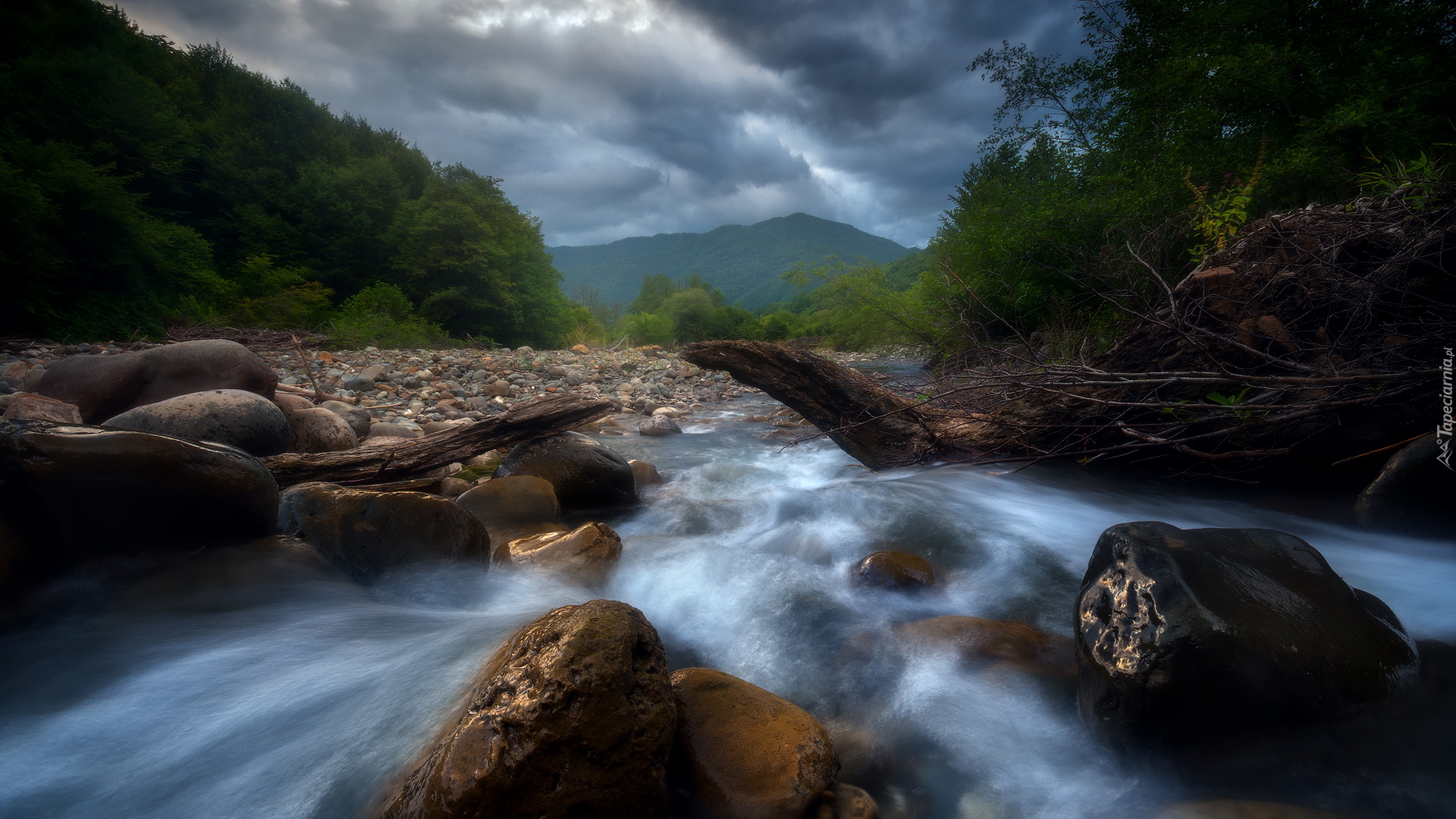 Edytor tapety: Kamienie i pnie drzew w rwącej górskiej rzece