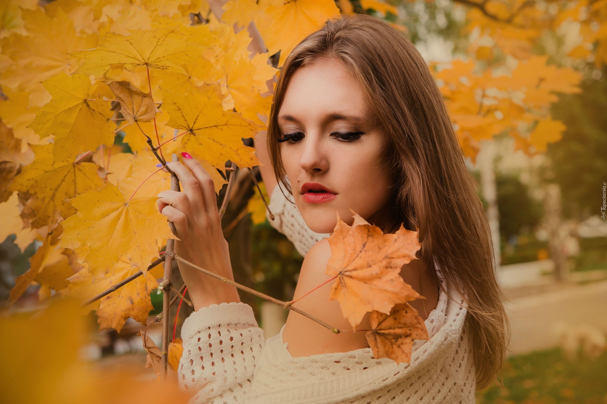 Edytor tapety: Dziewczyna przy gałązce z liśćmi