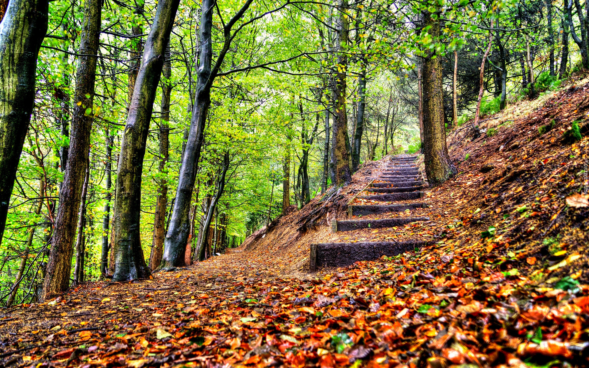 Edytor tapety: Zasypane liśćmi schody w lesie