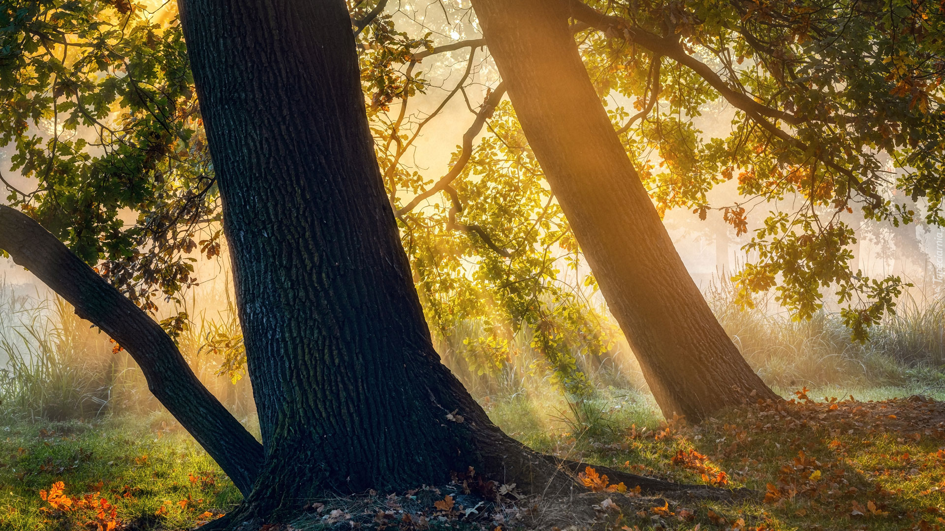 Edytor tapety: Promienie słońca wśród gałęzi drzewa