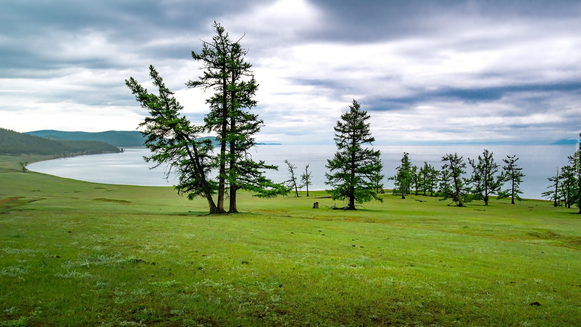 Edytor tapety: Drzewa iglaste na brzegu jeziora