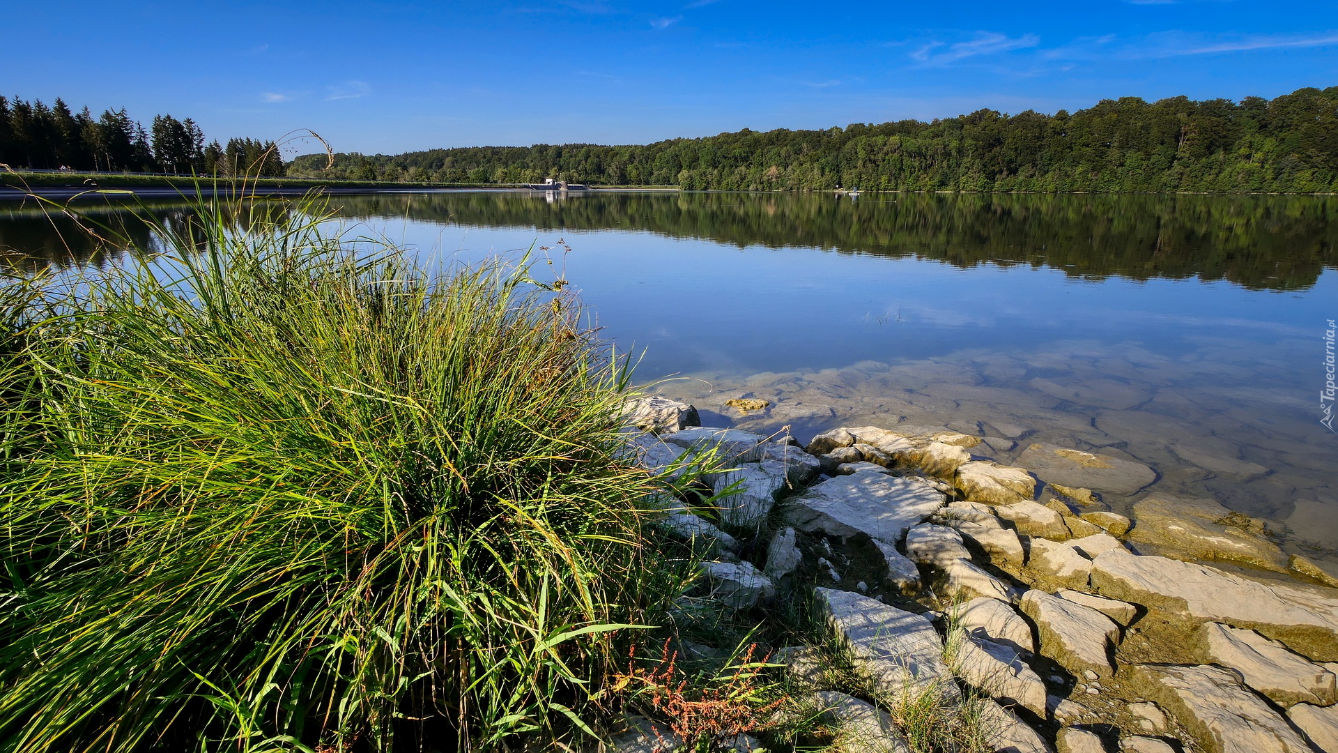Edytor tapety: Kępa trawy i kamienie przy brzegu jeziora