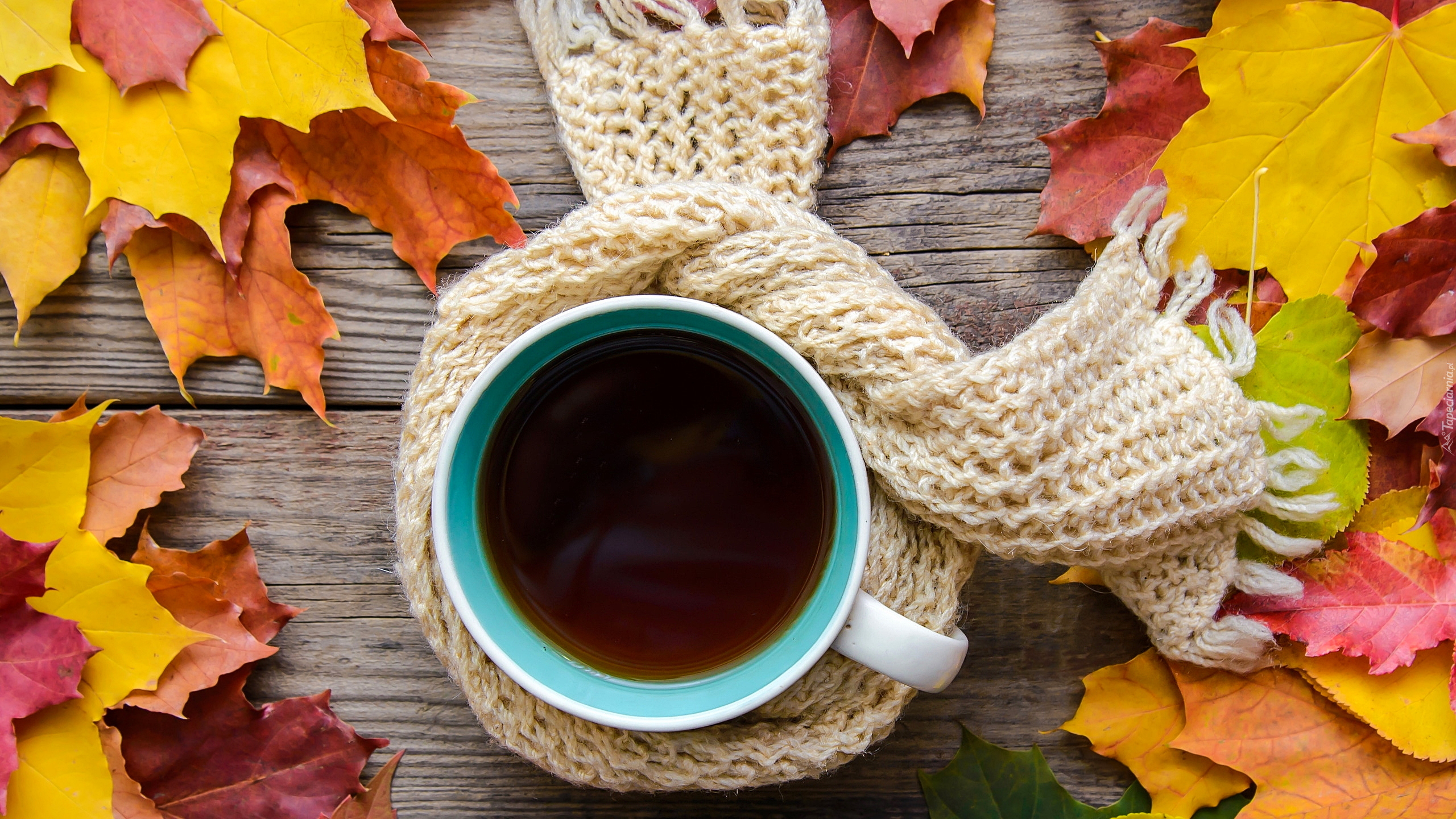 Edytor tapety: Kubek kawy owinięty szalikiem pośród liści klonu