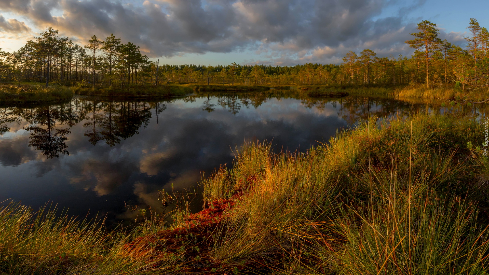Edytor tapety: Trawy i drzewa na brzegach jeziora