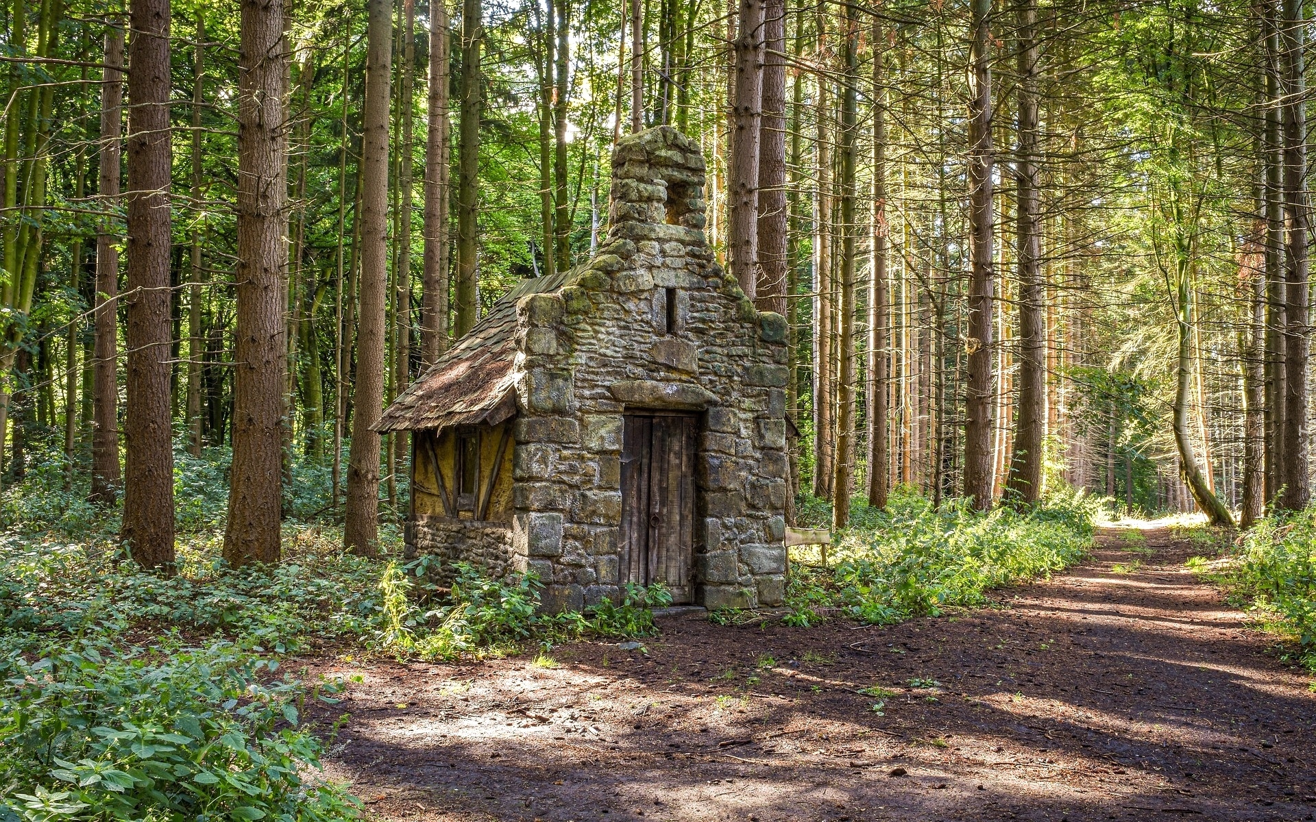 Edytor tapety: Opuszczona kapliczka przy drodze w lesie
