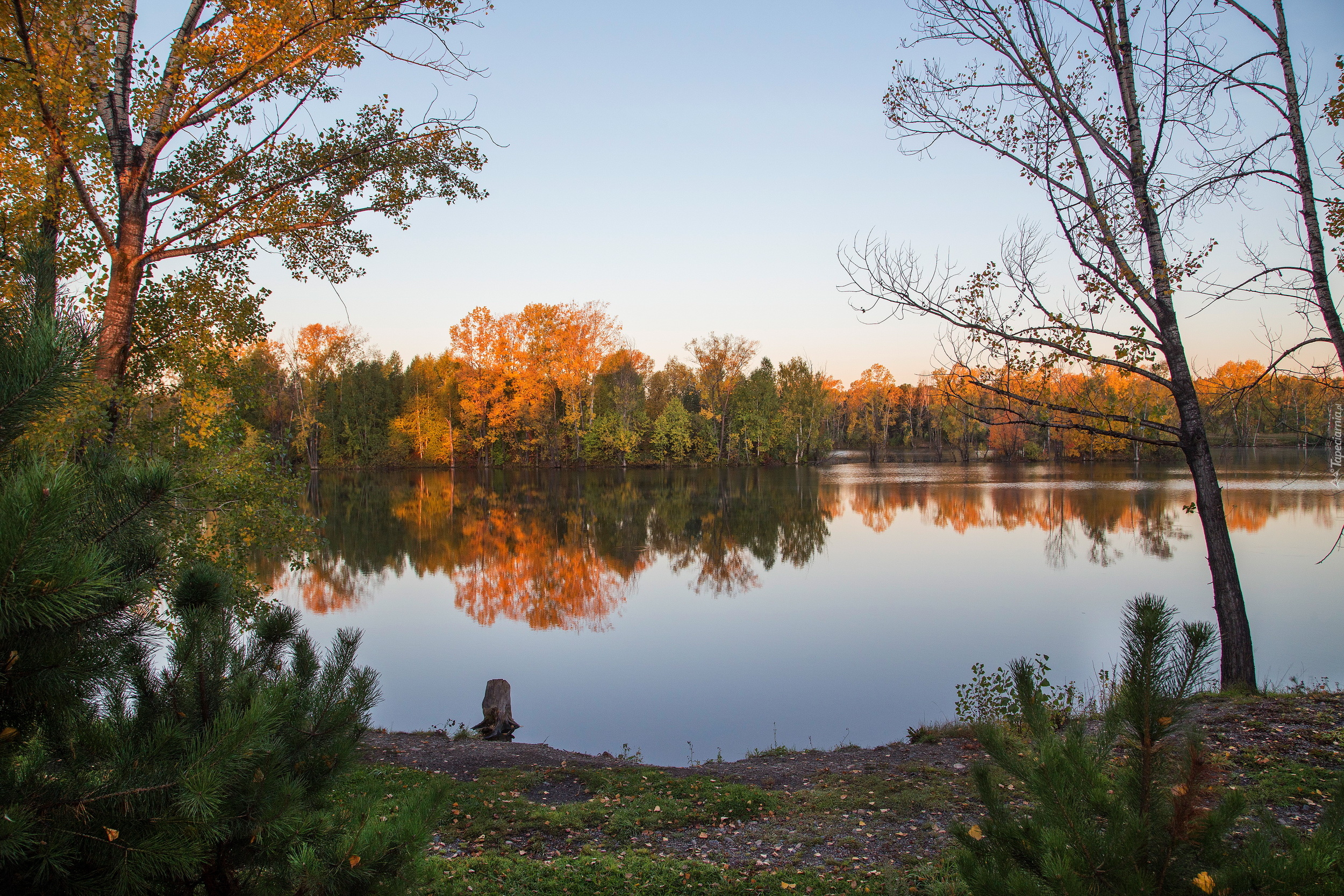 Edytor tapety: Odbicie drzew jesiennych w jeziorze