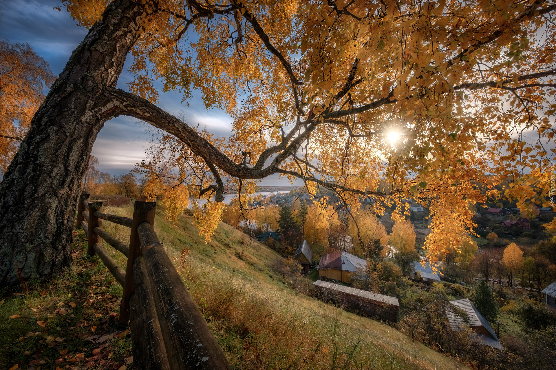 Edytor tapety: Jesienna brzoza za ogrodzeniem