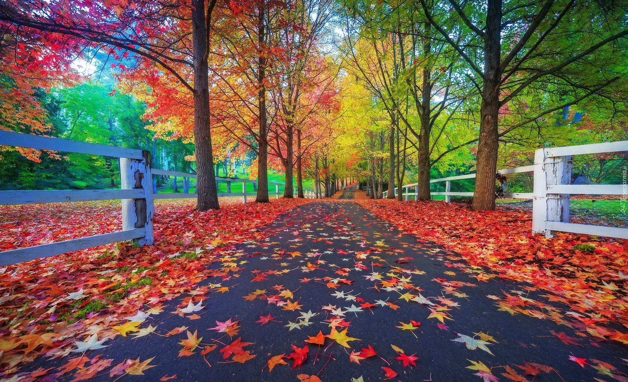 Edytor tapety: Opadłe liście na ogrodzonej drodze w jesiennym parku