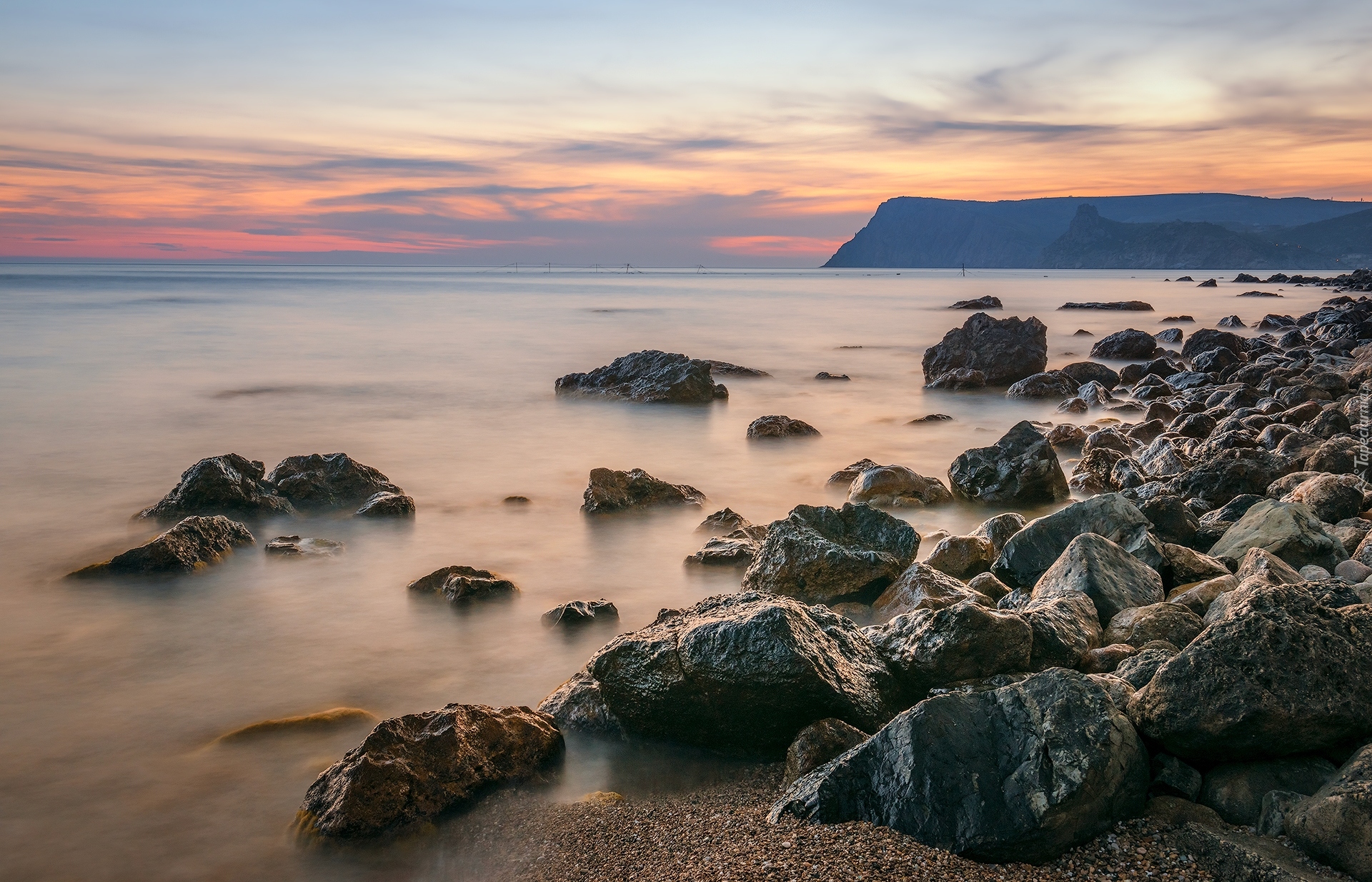 Edytor tapety: Wschód słońca nad kamienistym morskim brzegiem