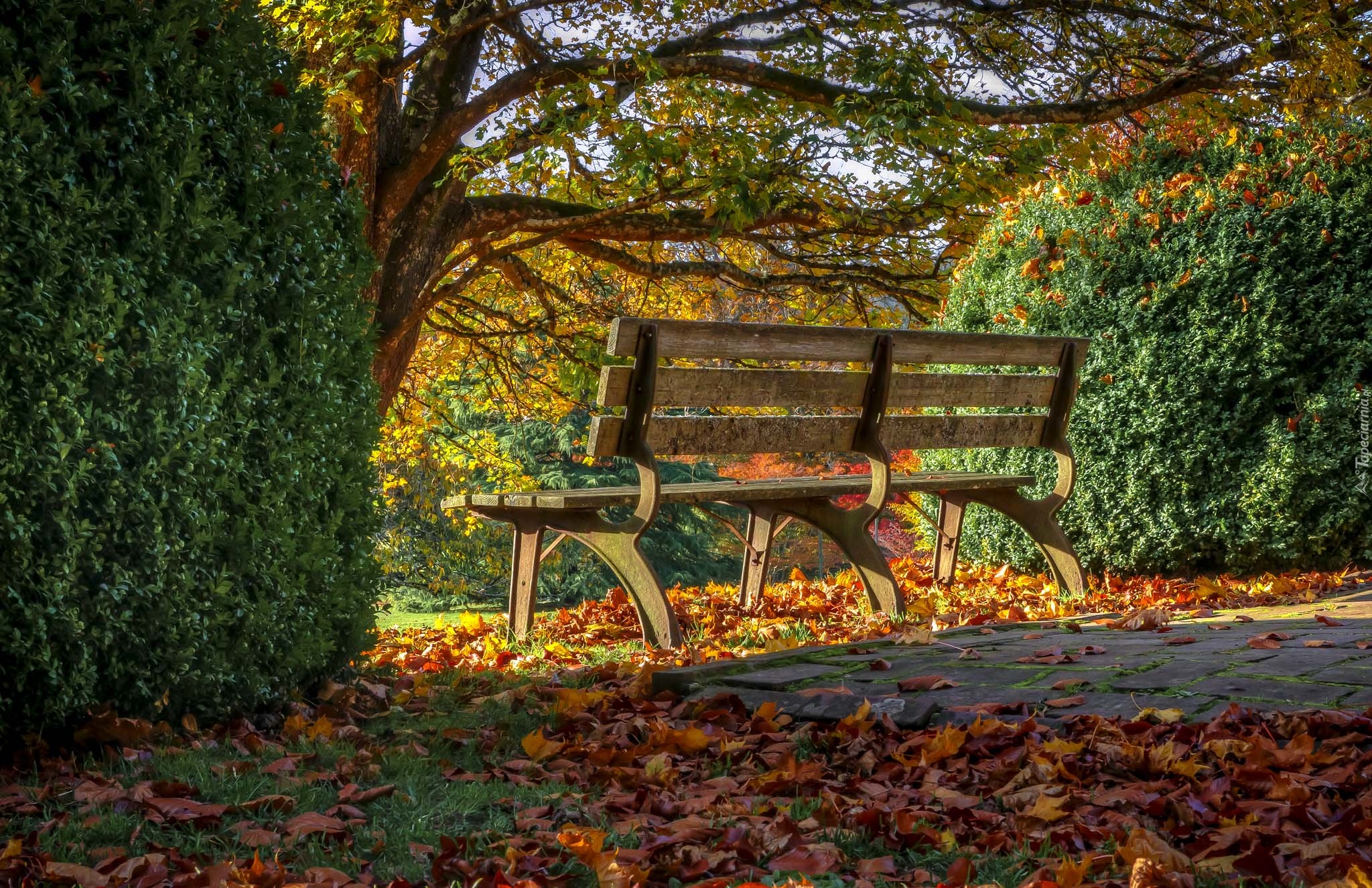 Edytor tapety: Ławka w parku pośród opadłych liści