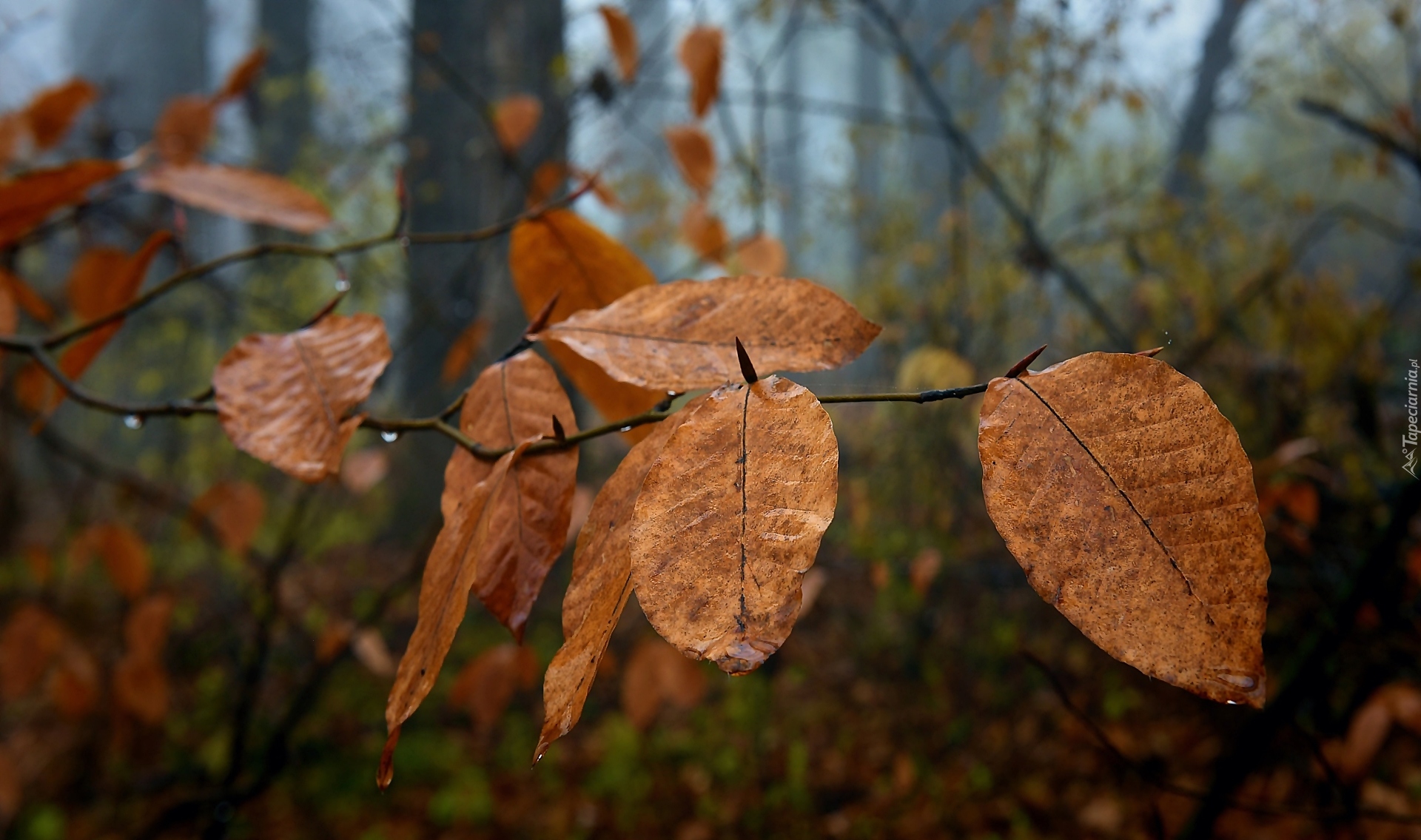 Edytor tapety: Mokre jesienne liście na gałązce