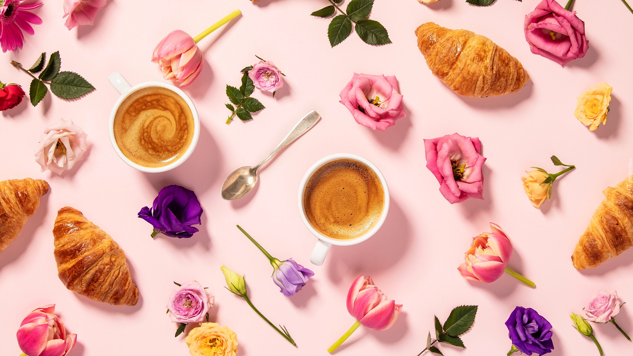 Edytor tapety: Kawa i rogaliki pośród kwiatów