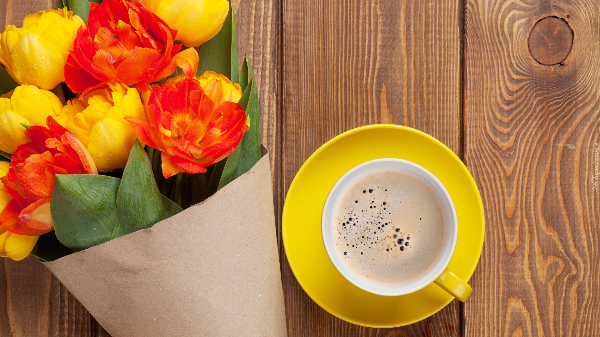 Edytor tapety: Bukiet tulipanow obok filizanki na deskach