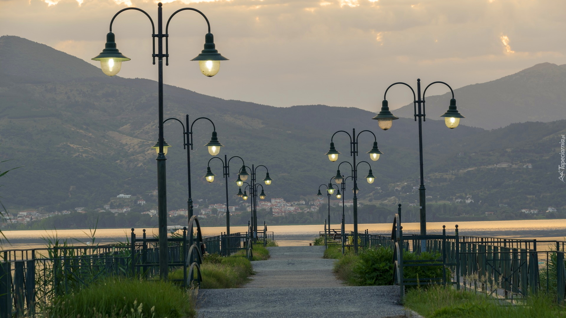 Edytor tapety: Oświetlona latarniami droga nad jezioro