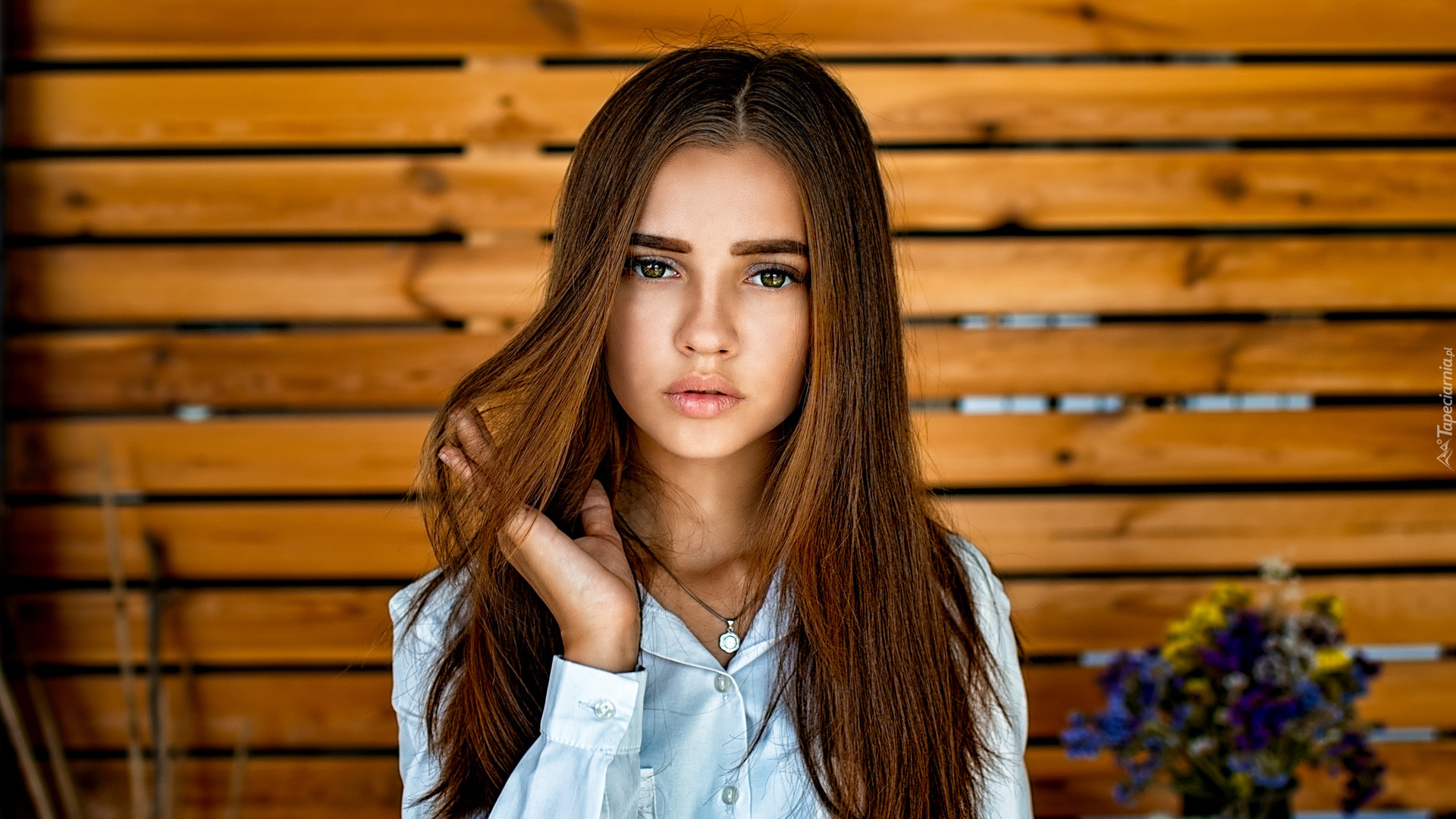 Edytor tapety: Długowłosa dziewczyna z kwiatami w tle