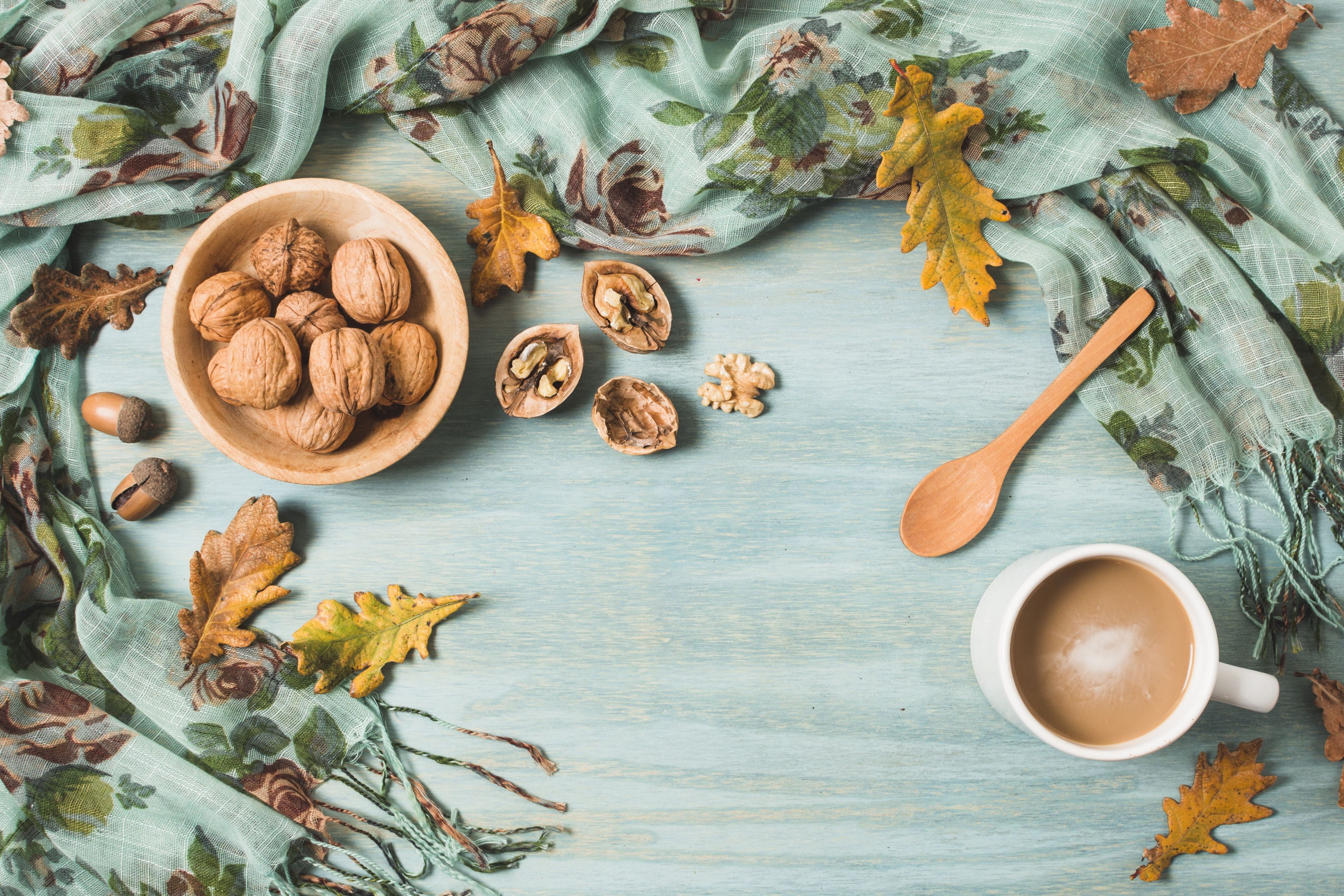 Edytor tapety: Kubek kawy i orzechy włoskie