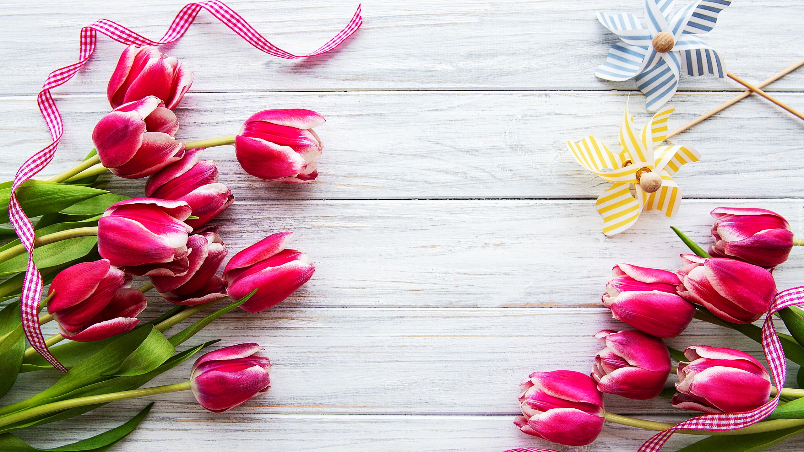 Edytor tapety: Dwa wiatraczki obok tulipanów