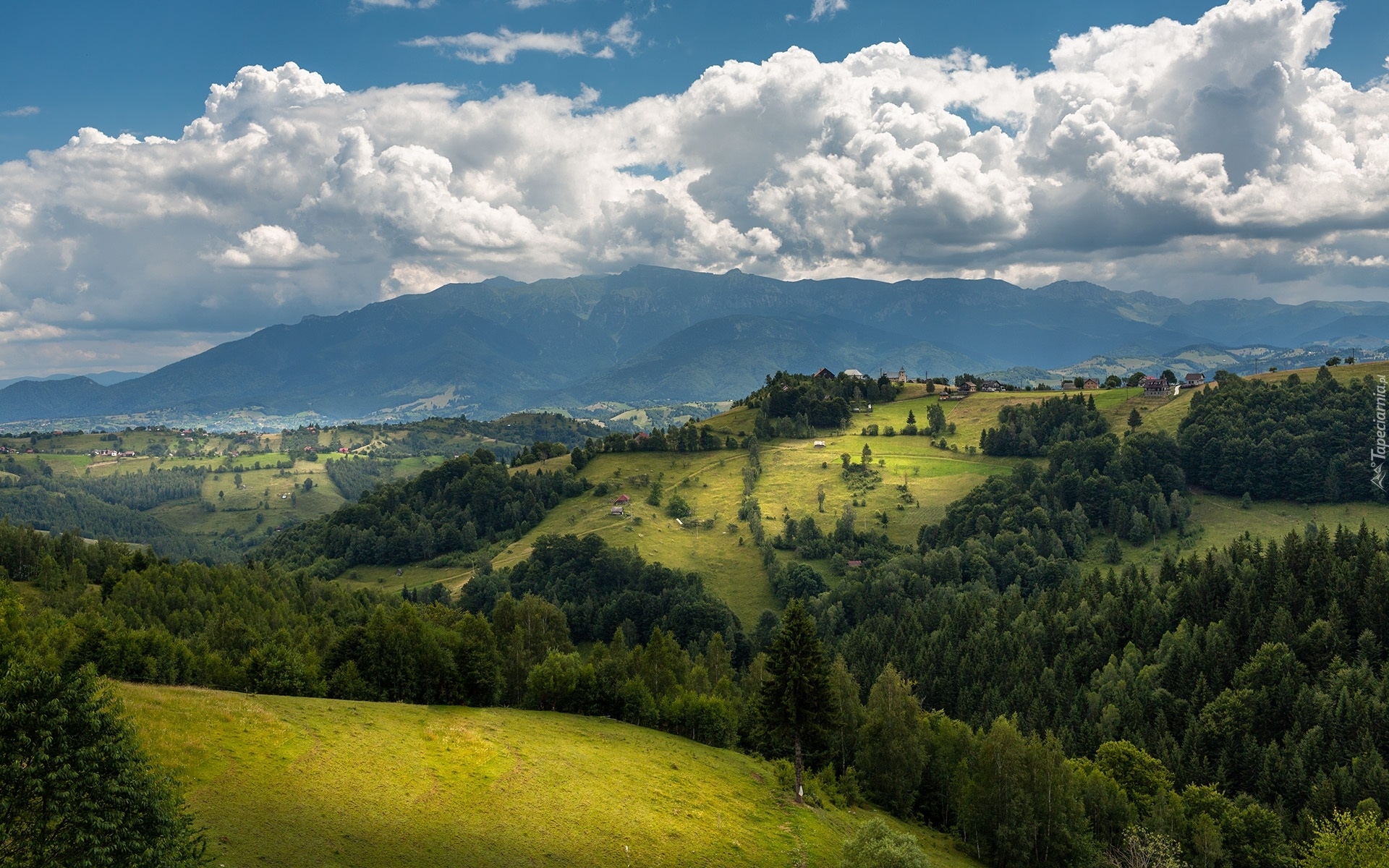 Edytor tapety: Domki na wzgórzach pośród drzew
