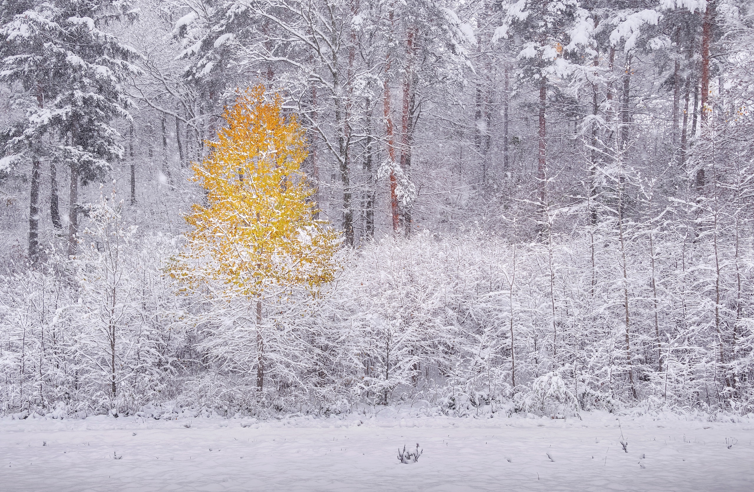 Edytor tapety: Żółte drzewo w ośnieżonym lesie