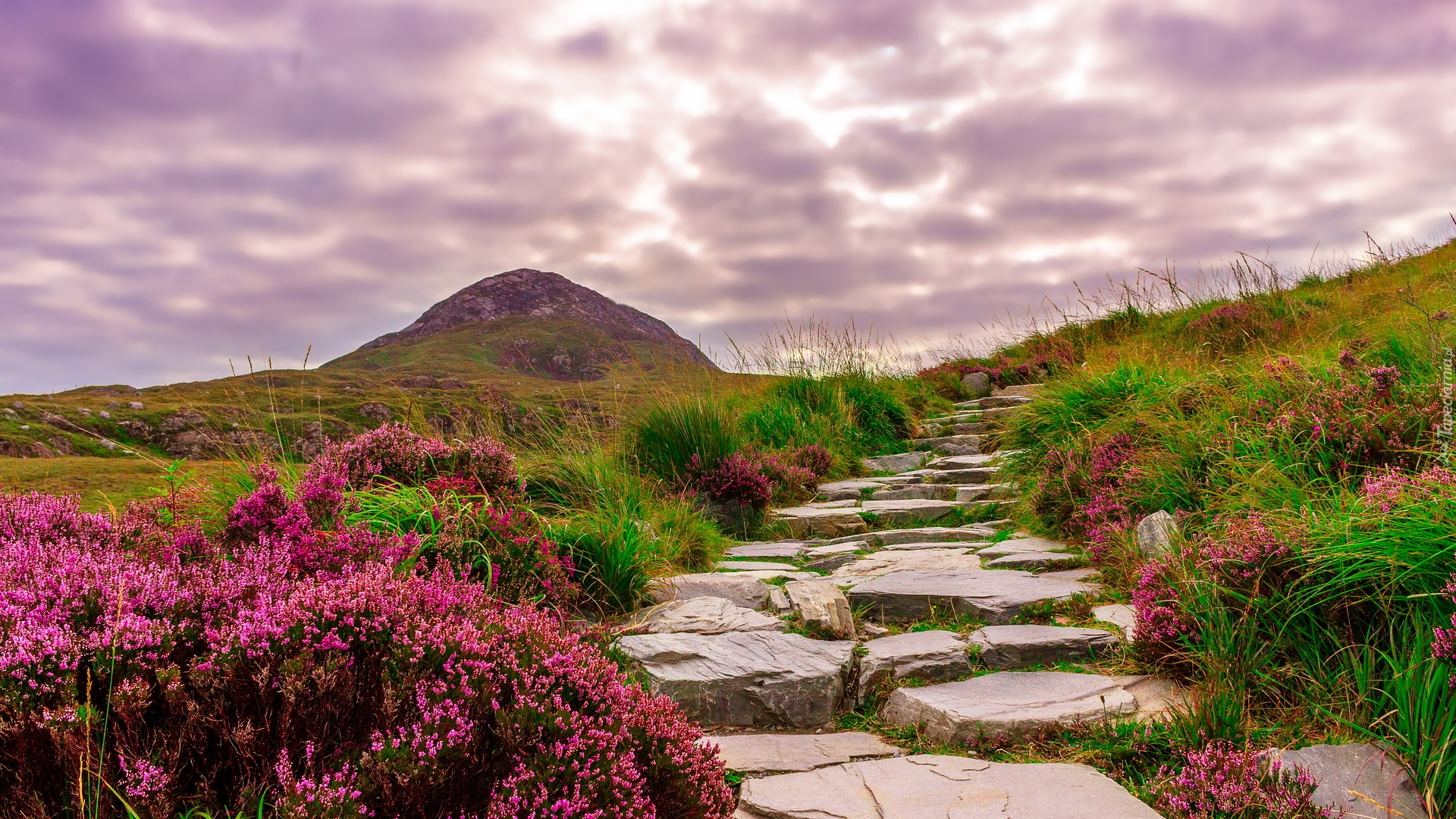 Edytor tapety: Wrzosy przy kamiennej ścieżce w Parku Narodowym Connemara