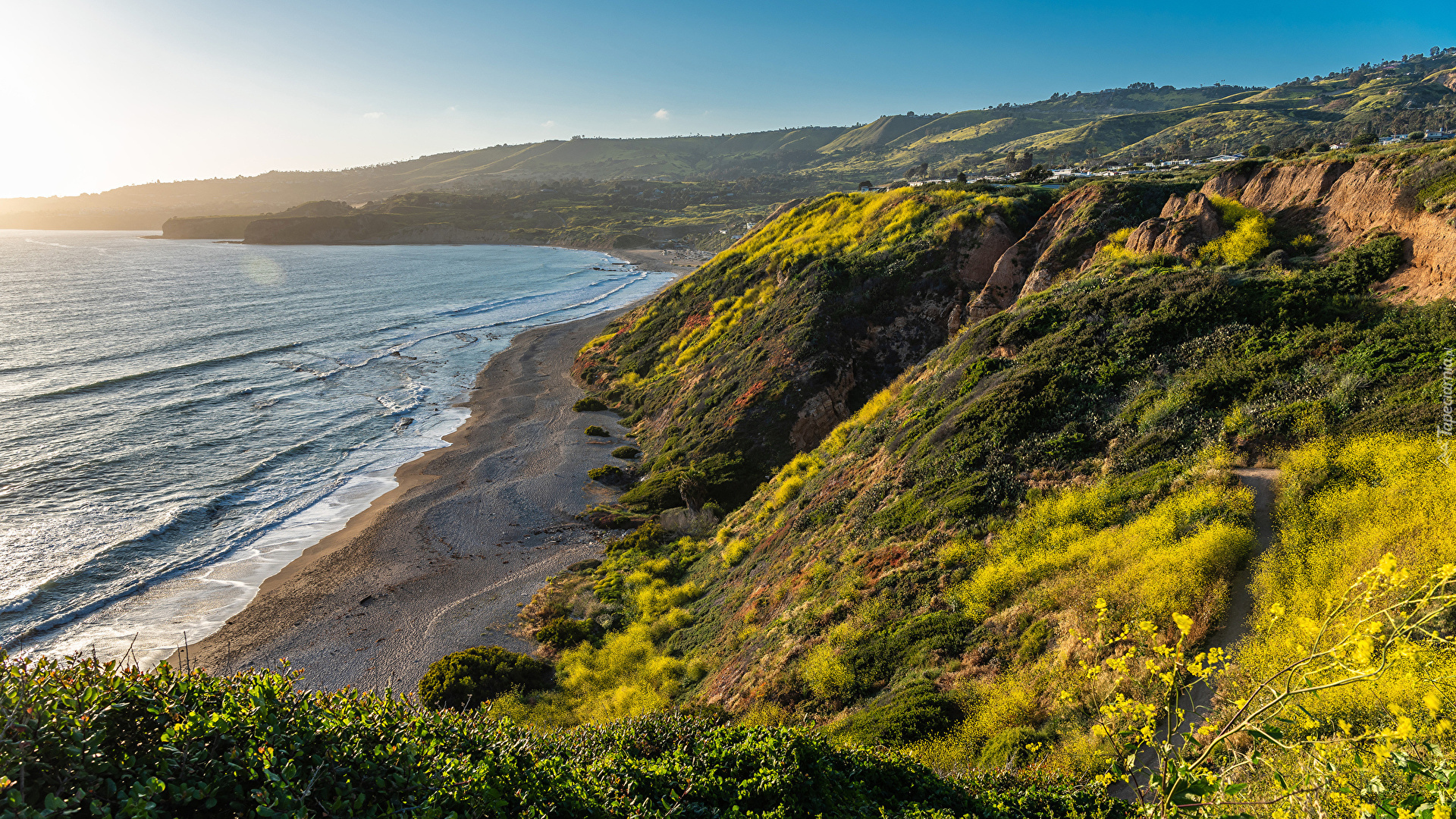 Edytor tapety: Zielone wzgórza nad morzem