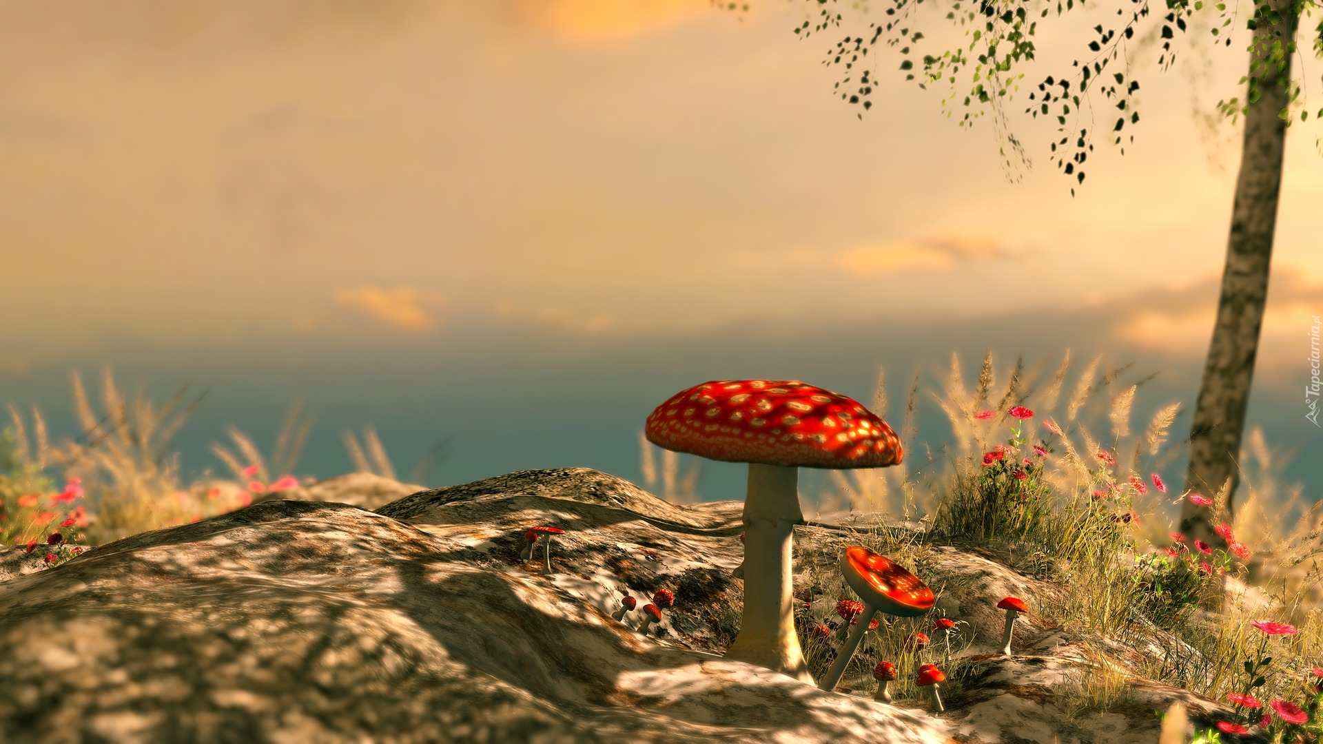 Edytor tapety: Muchomory pod brzózką w grafice