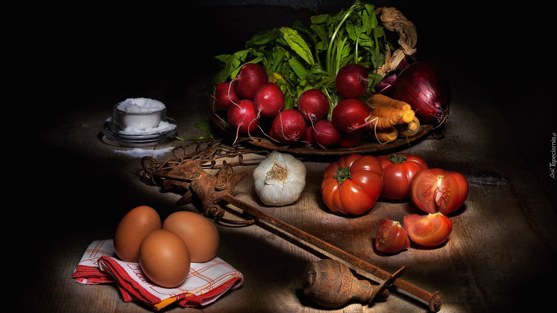 Edytor tapety: Rzodkiewki i pomidory obok jajek i czosnku