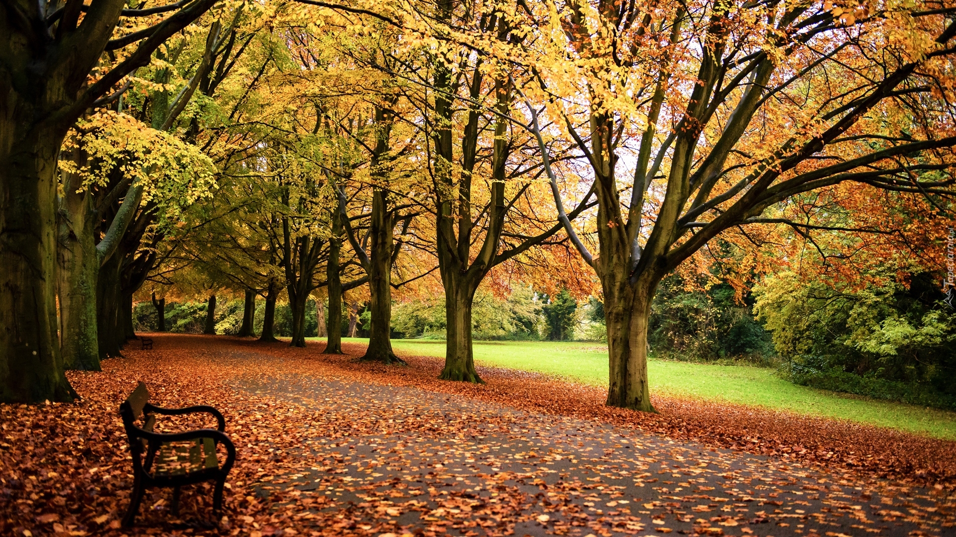Edytor tapety: Drzewa i ławeczka w parku