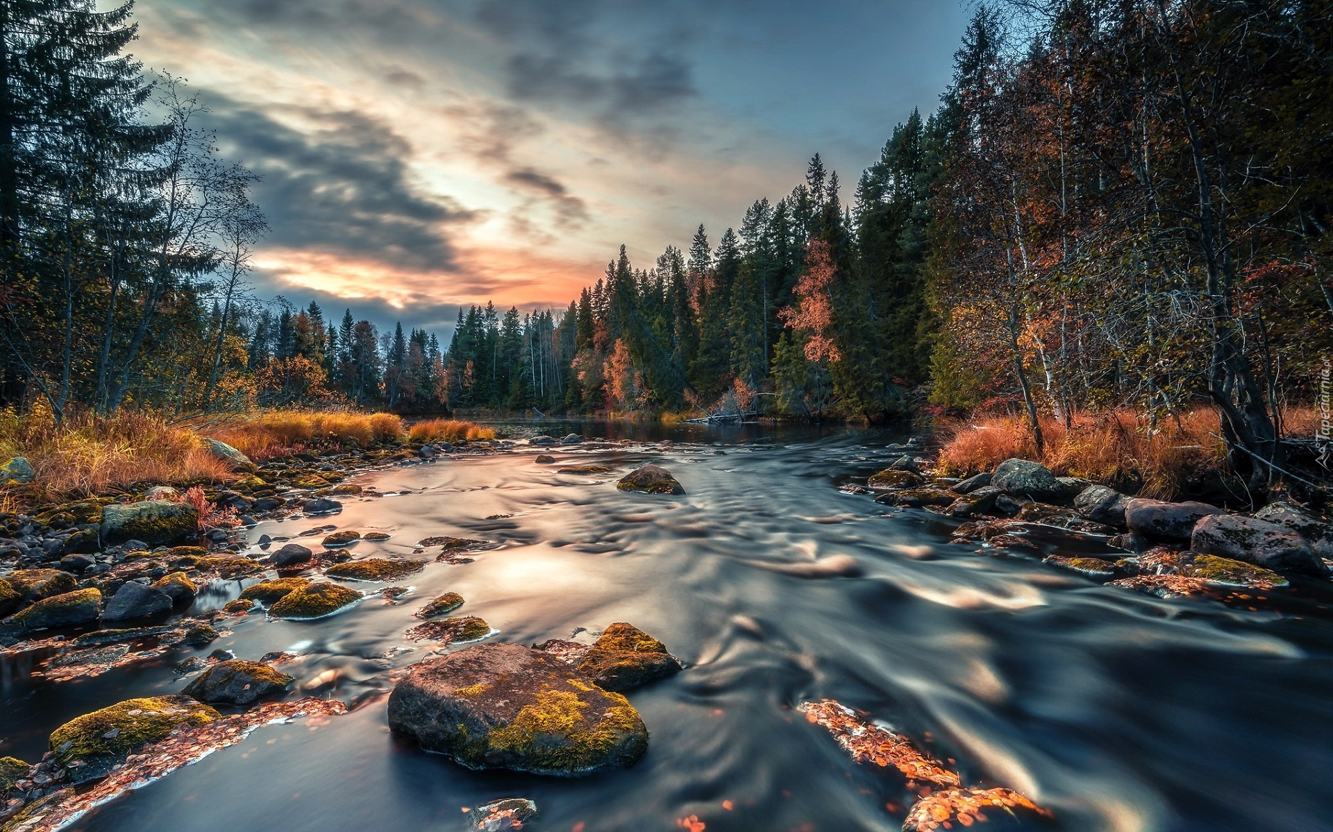 Edytor tapety: Jesienny las i trawy na brzegach kamienistej rzeki