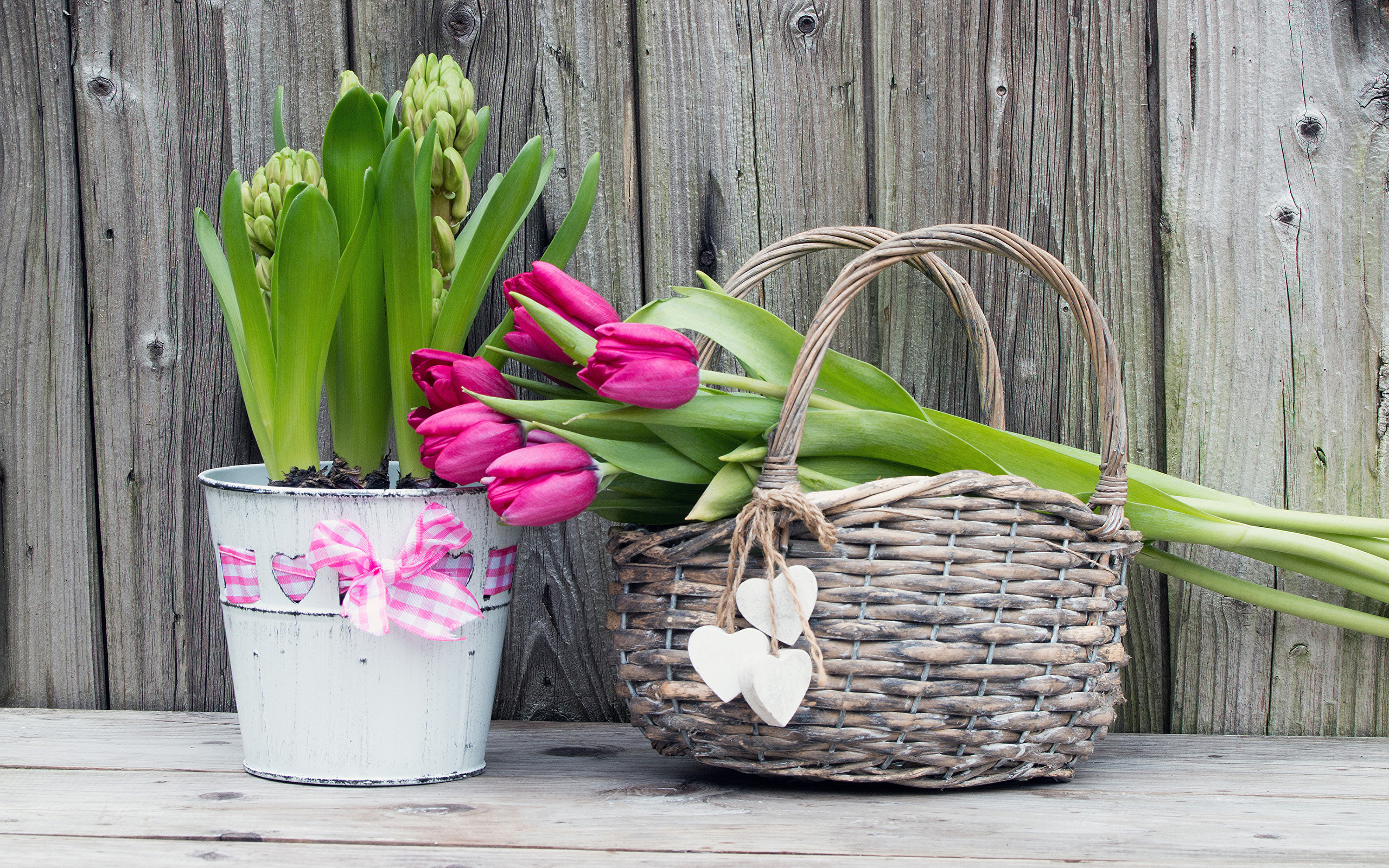 Edytor tapety: Hiacynty w wiaderku obok koszyka z tulipanami