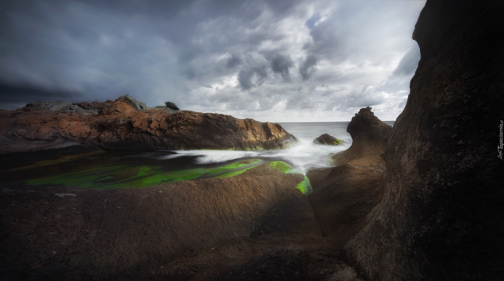 Edytor tapety: Zachmurzone niebo nad morskimi skałami