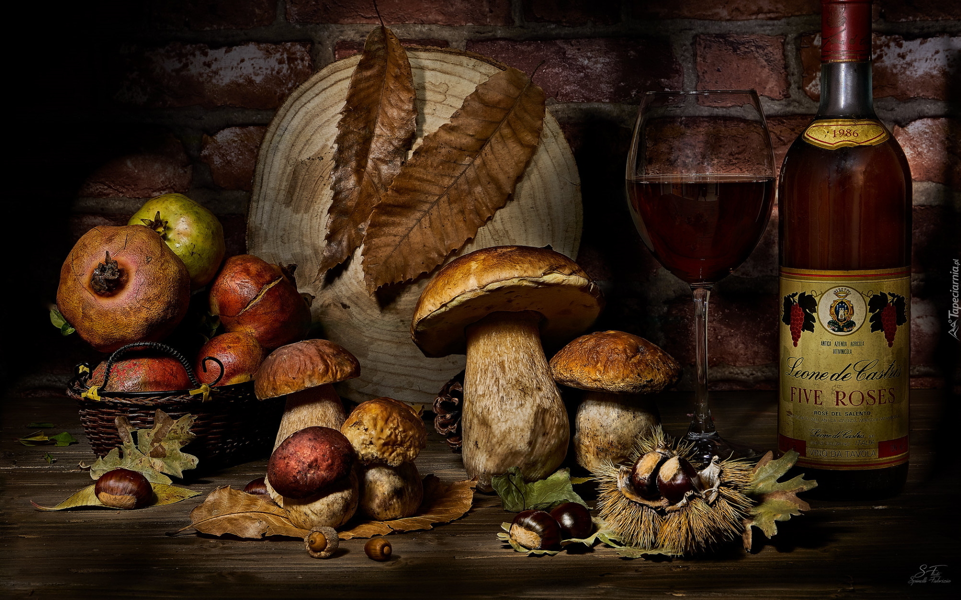 Edytor tapety: Grzyby obok kieliszka i butelki wina