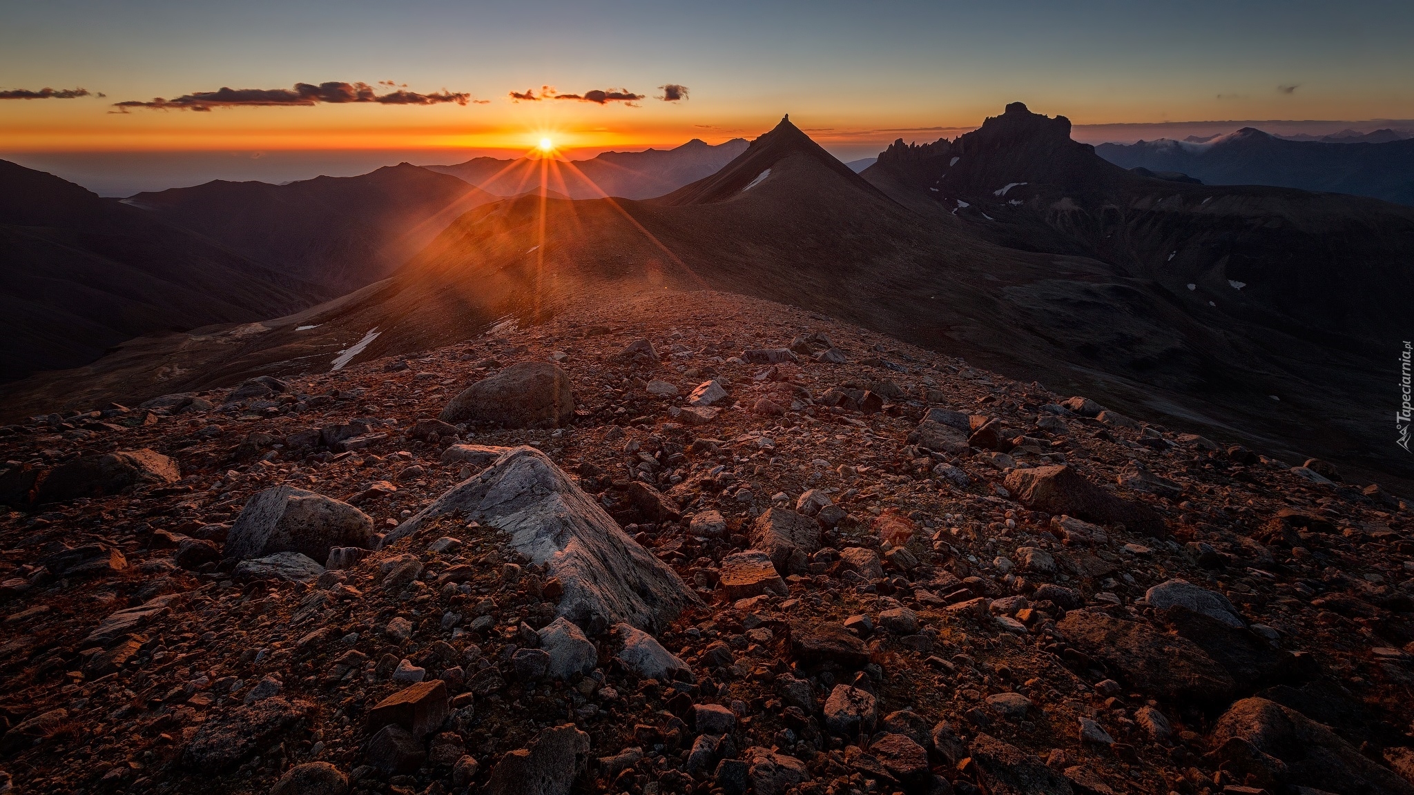 Edytor tapety: Promienie słońca padające na kamienie w górach