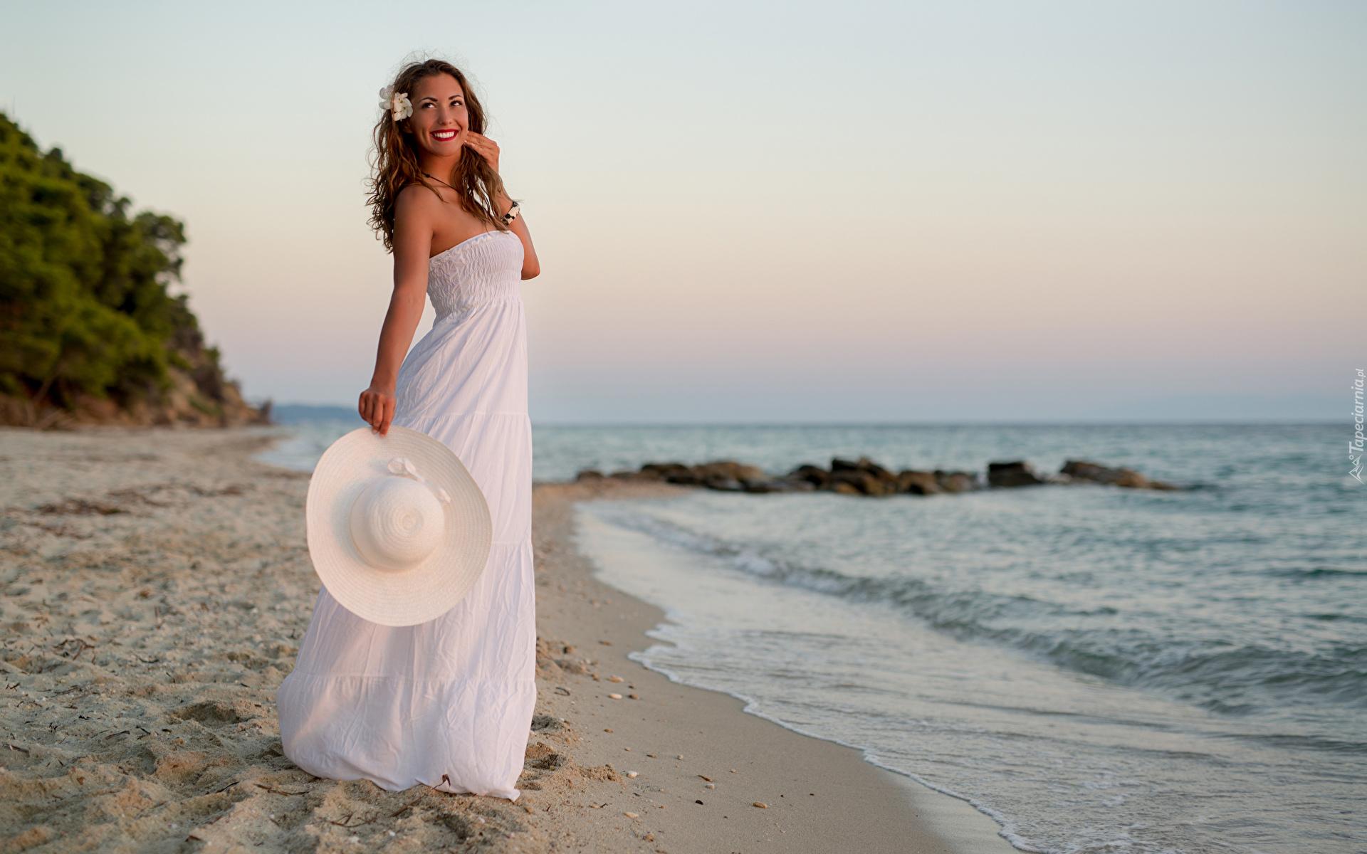 Edytor tapety: Kobieta w białej sukni nad brzegiem morza