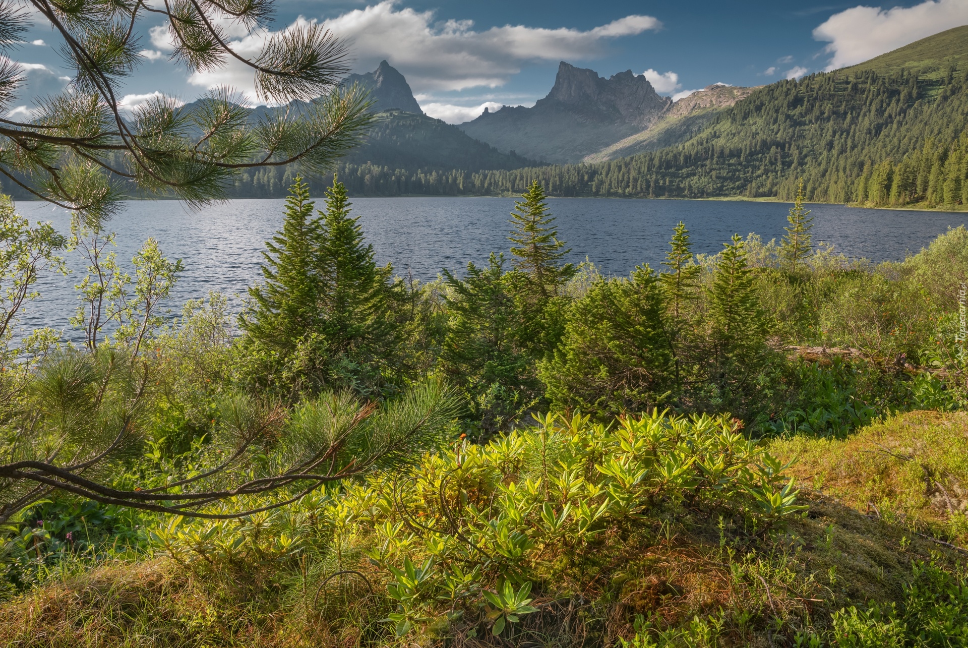 Edytor tapety: Drzewka iglaste na tle górskiego jeziora