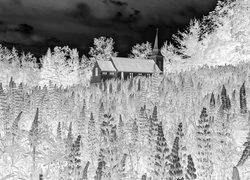 Edytor tapety: Biały kościół na łubinowej łące w Vik i Myrdal