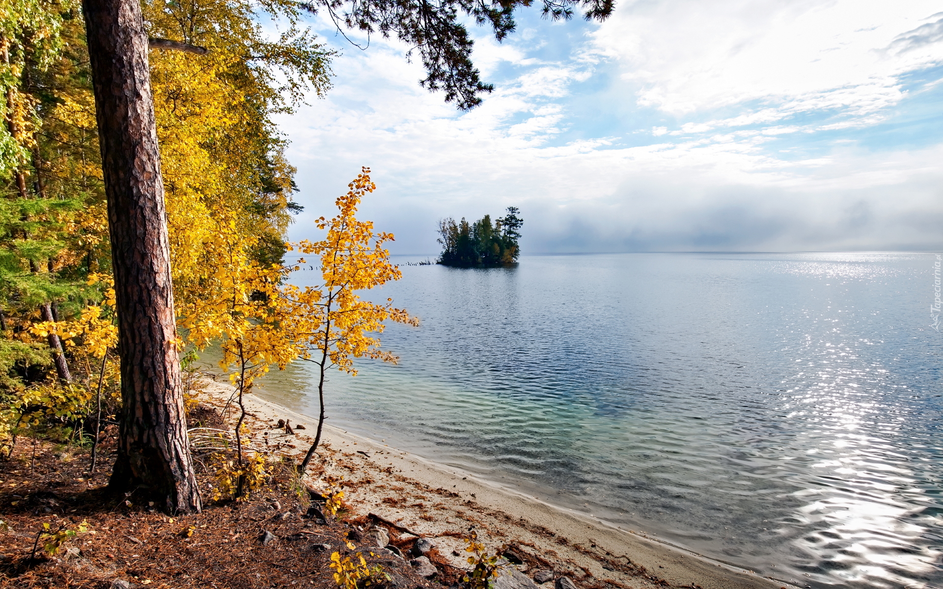 Edytor tapety: Jesienne drzewa na brzegu jeziora Turgoyak w Rosji