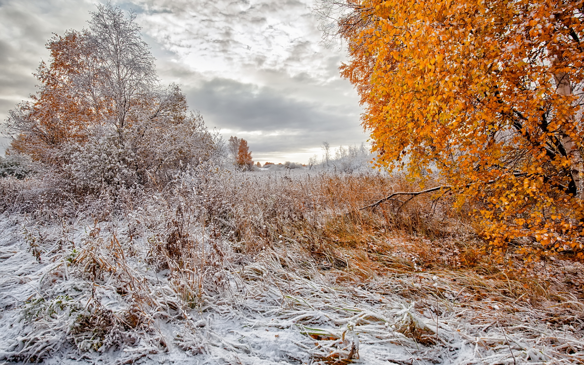 Edytor tapety: Pierwszy śnieg na jesiennych drzewach i roślinach