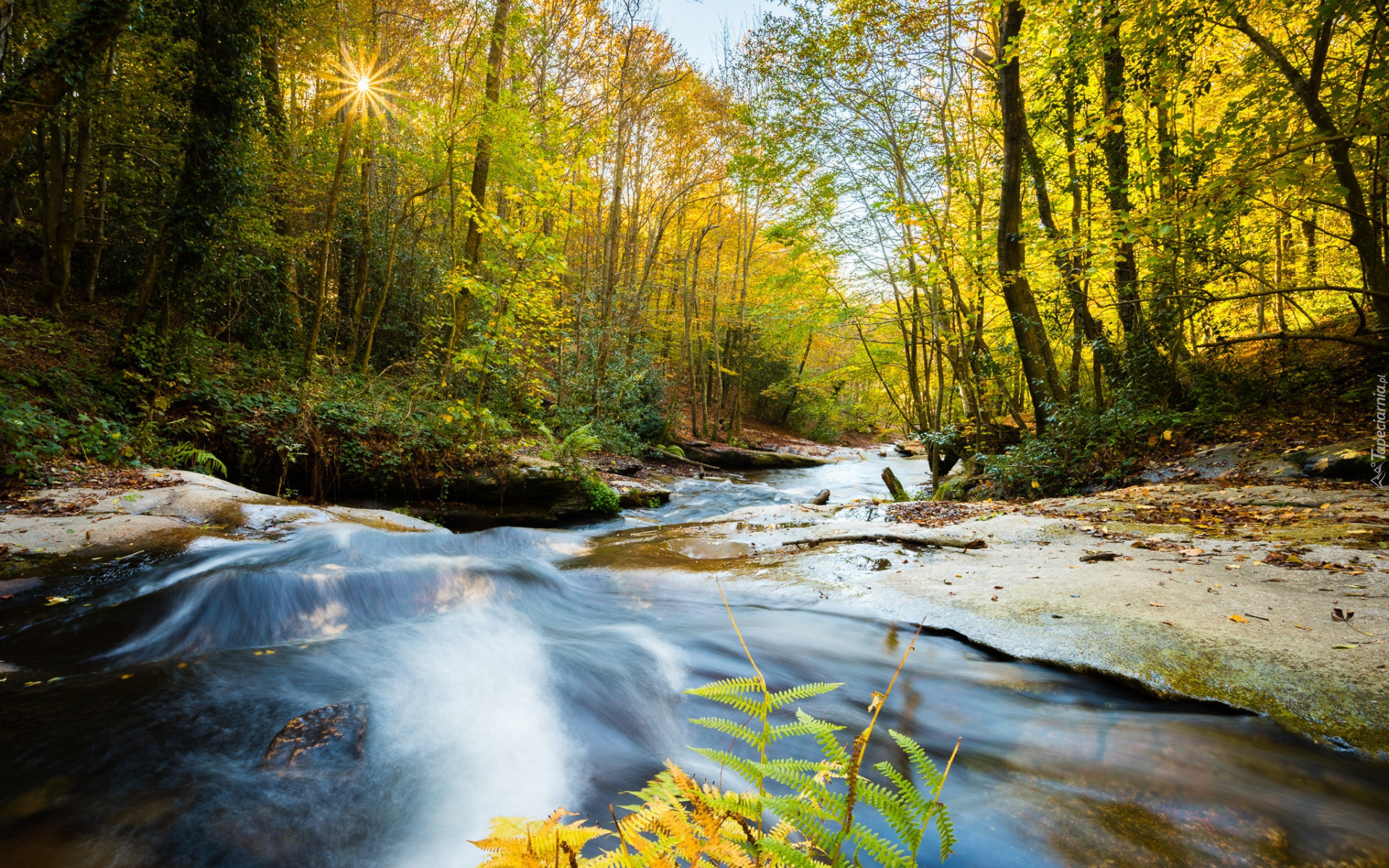 Edytor tapety: Promienie słońca nad leśną rzeką