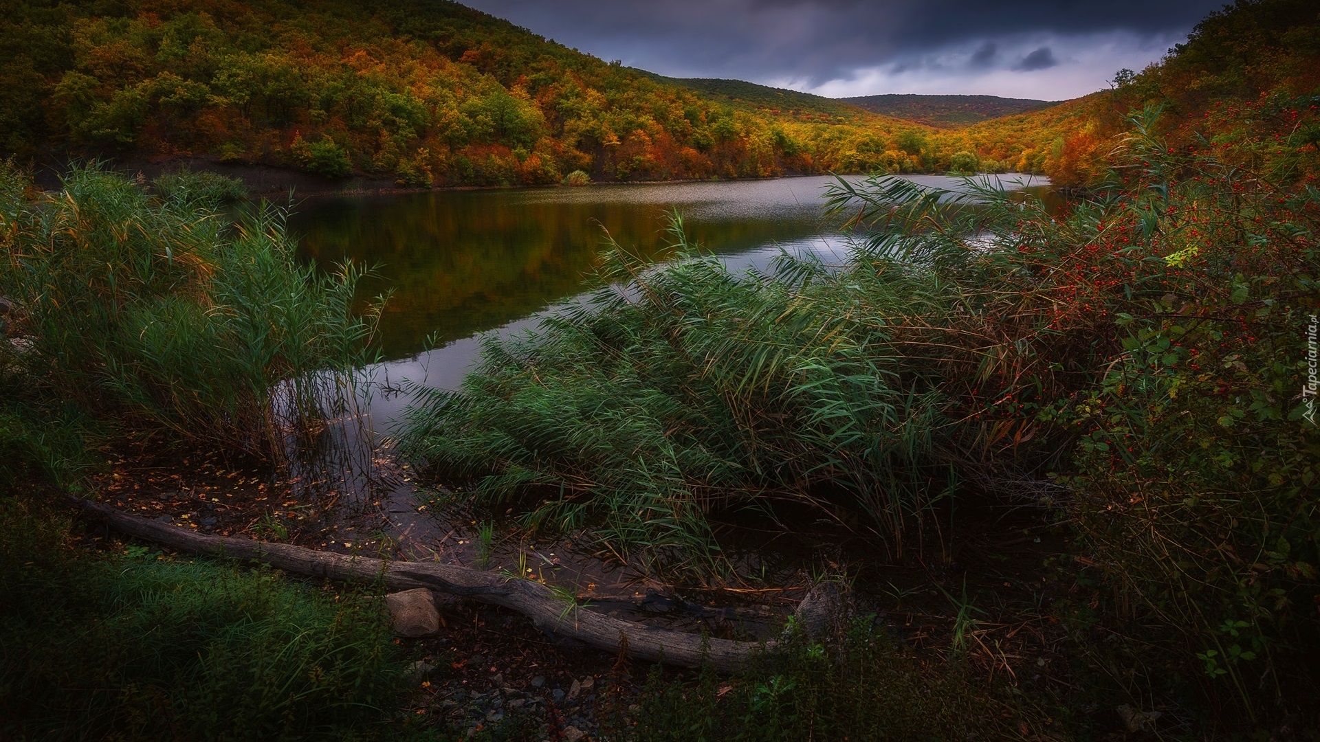 Edytor tapety: Zielone rośliny na brzegu jeziora