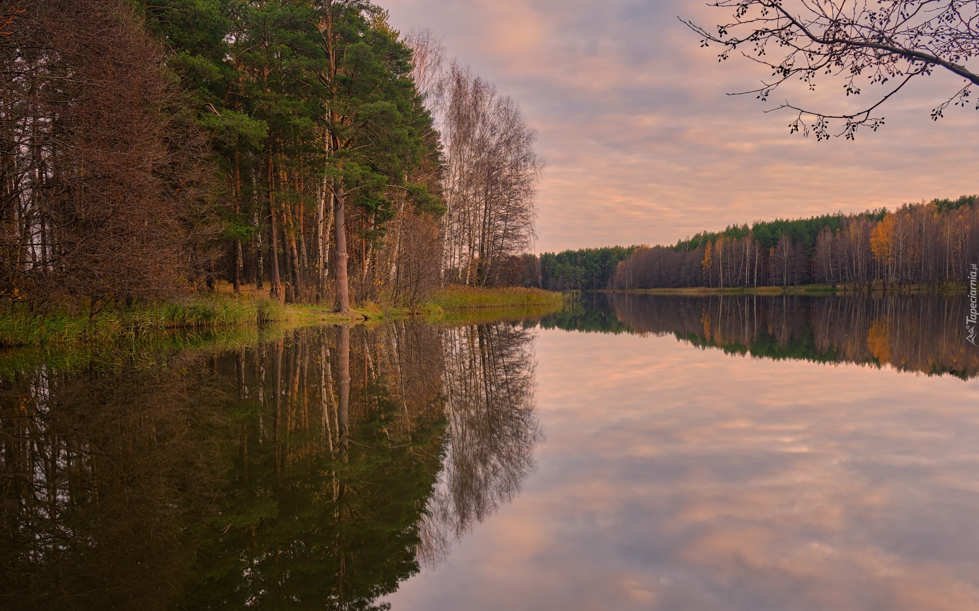 Edytor tapety: Drzewa i trawy nad jeziorem jesienną porą