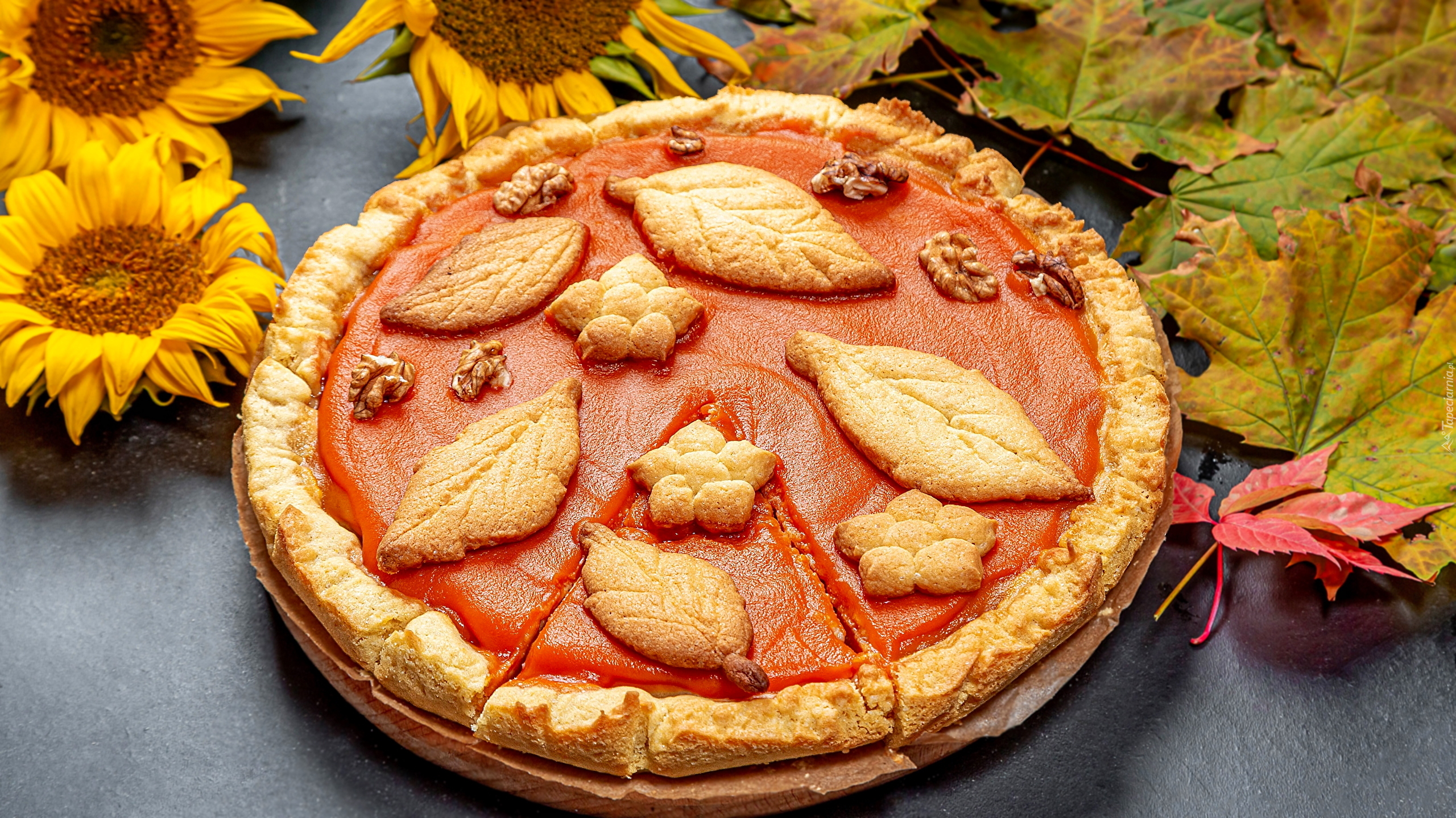Edytor tapety: Słoneczniki i liście obok ciasta