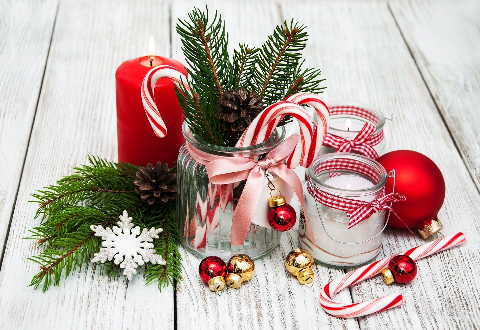 Edytor tapety: Gałązki świerku w słoiku obok świec i bombek