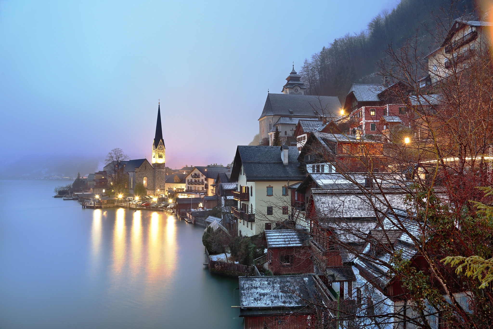 Edytor tapety: Oświetlone wieczorem miasto Hallstatt w jesiennej mgle