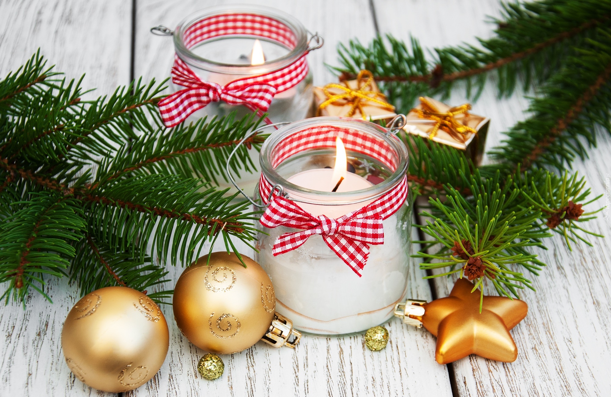 Edytor tapety: Świece w słoikach obok gałązek świerka i bombek