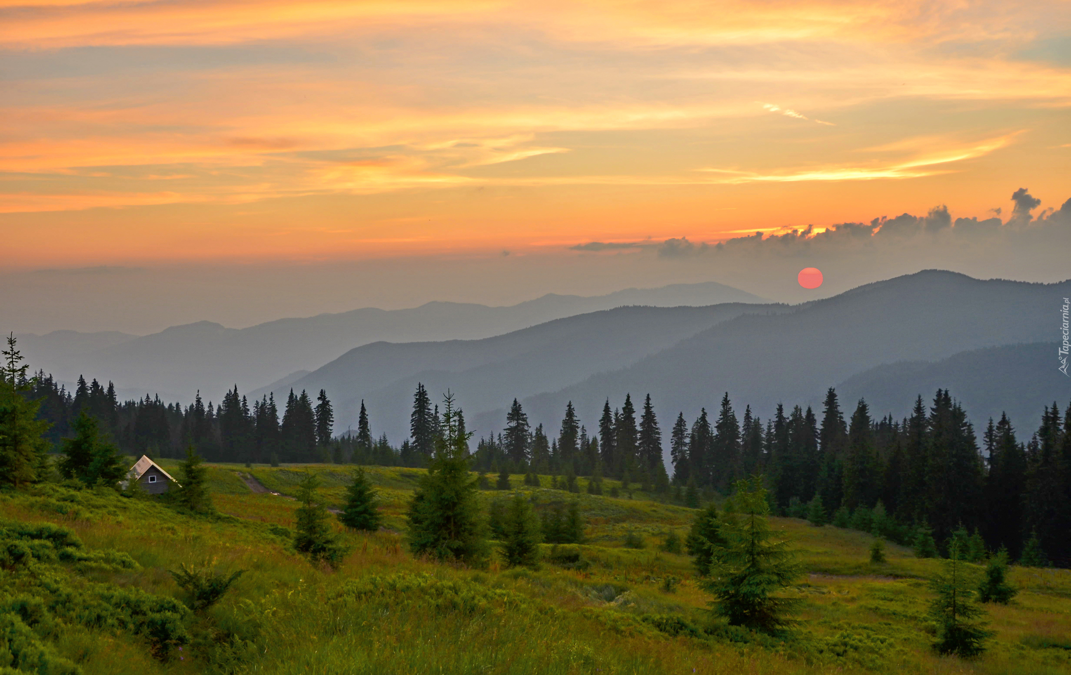 Edytor tapety: Słońce za chmurami nad zamglonymi górami