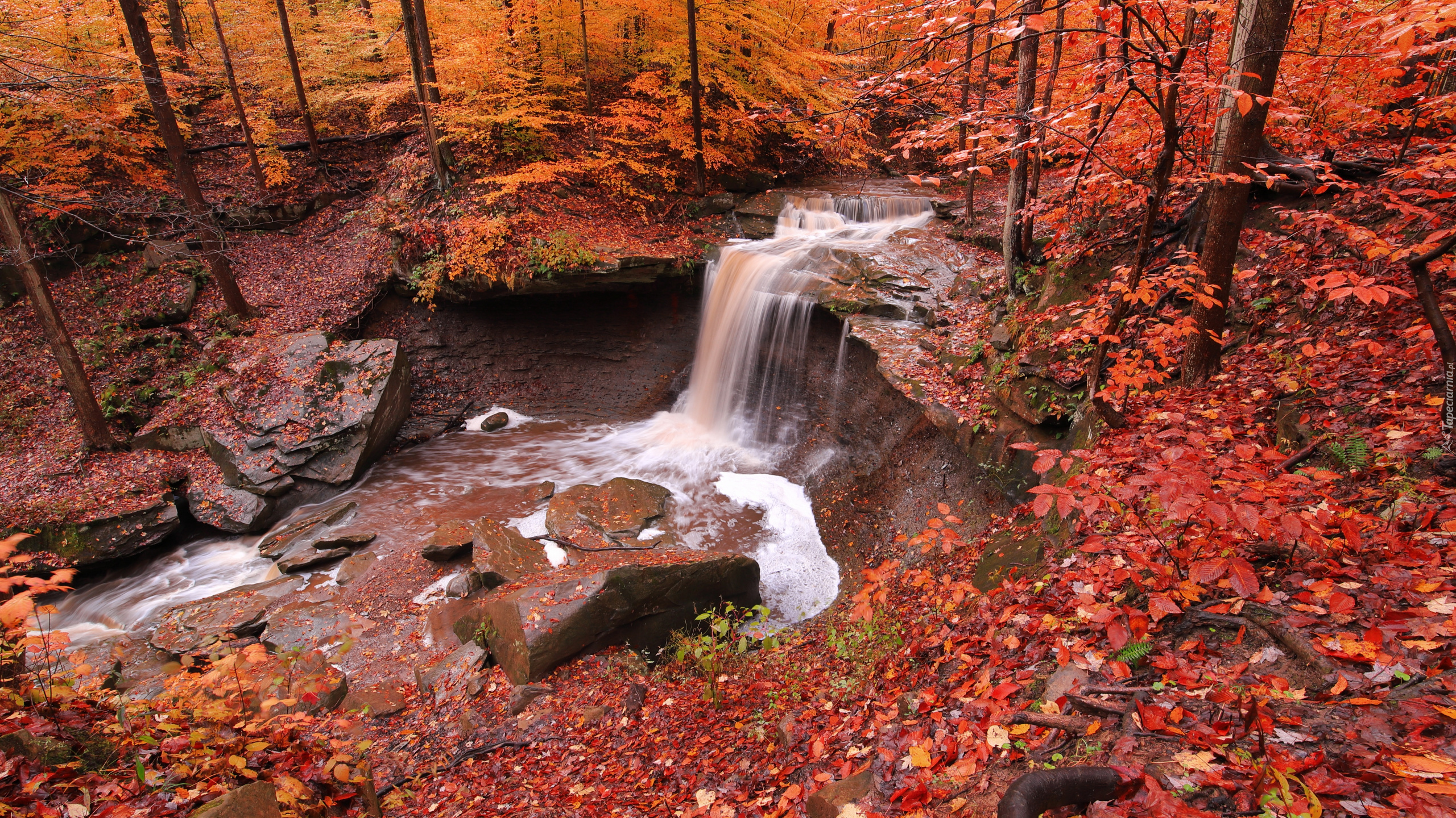 Edytor tapety: Czerwone opadłe liście wokół leśnego wodospadu